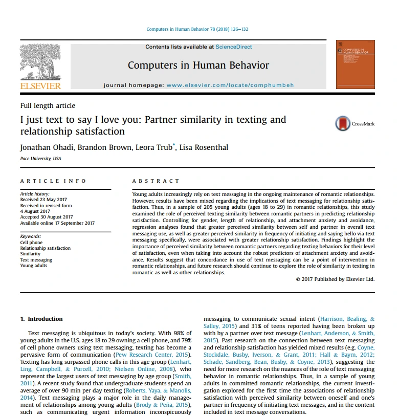Ohadi, J., Brown, B., Trub, L., & Rosenthal, L. (2018). I just text to say I love you: Partner similarity in texting and relationship satisfaction. Computers in Human Behavior, 78, 126-132.
