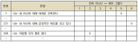 *** 반응일관성: 동의/반의 관계에 있는 문항 쌍을 거리를 두고 배치, 문항 쌍 사이의 상관을 추정하는 것으로, 응시자가 자신에 대해 일관된 응답을 하고 있다면 위 예에서 7번 문항과 221번 문항은 정적 상관을 보여야 하며, 7, 221번과 304번은 부적 상관을 보여야 한다>