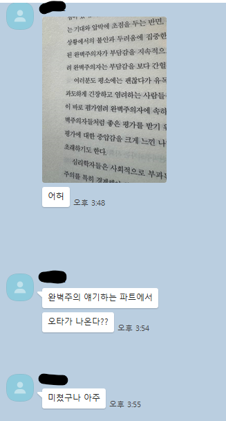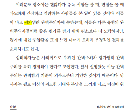 아... 이게 뭐란 말입니까ㅠㅠ 46쪽에 떡하니 오타가 들어있는 것이 보였습니다. '평가염려 완벽주의자'여야 하는데, '폄가염려 완벽주의자'라니요!!! 친구 말마따나 정말 아이러니한 일이 아닐 수 없었습니다. '완벽주의' 이야기를 하는데 거기에서 오타가 작렬했군요.