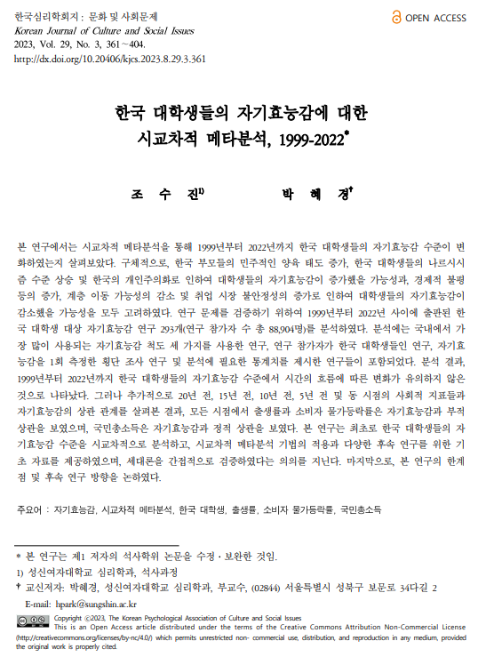 이런 맥락에서, 최근 진행되었던 매우 흥미로운 심리학 연구를 한 편 소개하고 싶다. 한국 대학생들의 자기효능감 추이를 1999년부터 2022년까지, 추적하여 변화 양상을 분석한 연구가 있다.