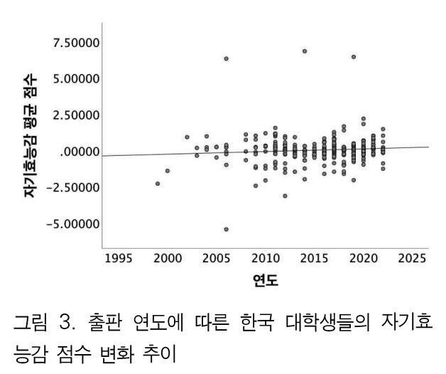 위 논문에서는 시교차적 메타분석cross-temporal meta-analysis이라는 기법이 쓰였다. 학술적인 이야기는 차치하고 간단하게 말하면, 정해진 기간(본 논문에서는 1999-2022) 동안 '자기효능감'이 측정된 논문들을 싸그리 모아서, 자기효능감 점수가 연도에 따라 어떻게 변화했는지를 알아봤다고 이해하면 된다. 당연하겠지만 똑같은 심리척도를 사용한 논문만 수집되며, 각 논문에서 측정된 사례 수가 커질수록 높은 가중치를 설정하여 분석을 진행하게 된다. 그럼 분석 결과는 어땠을까?