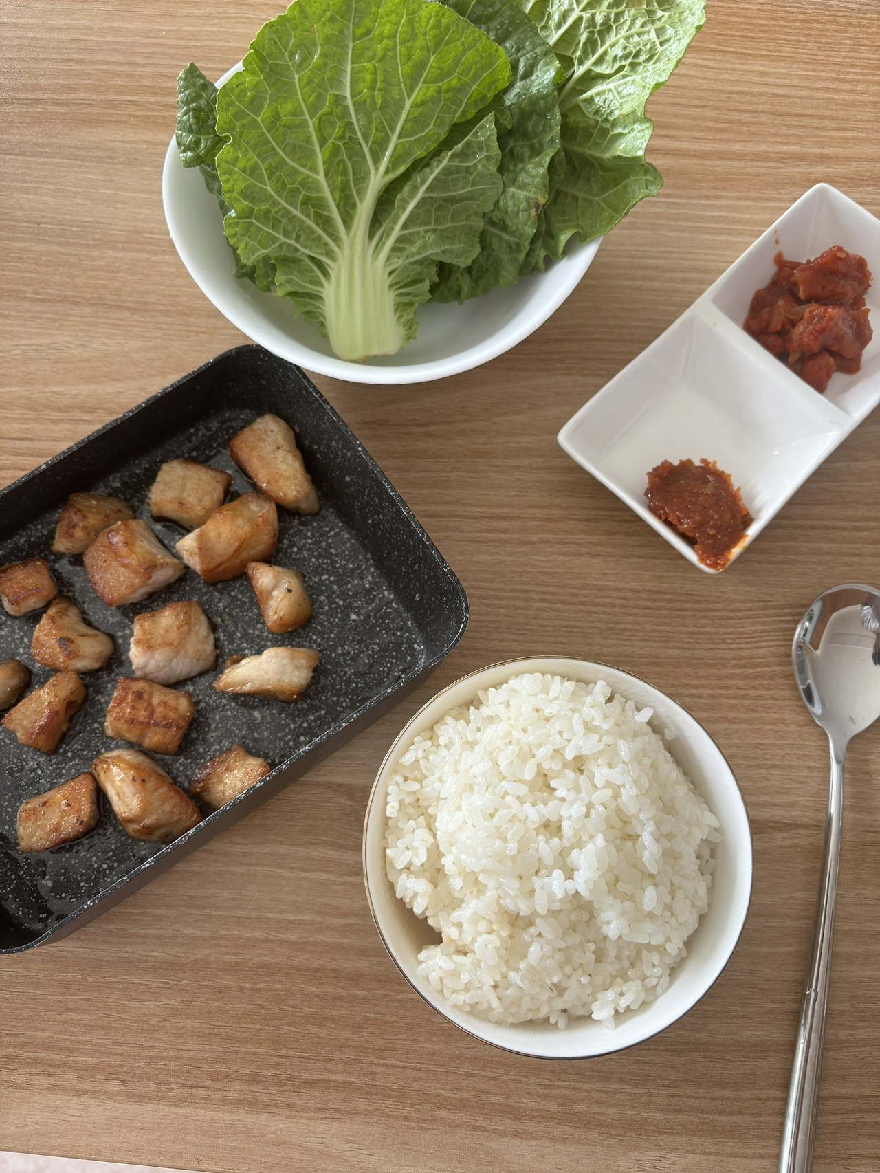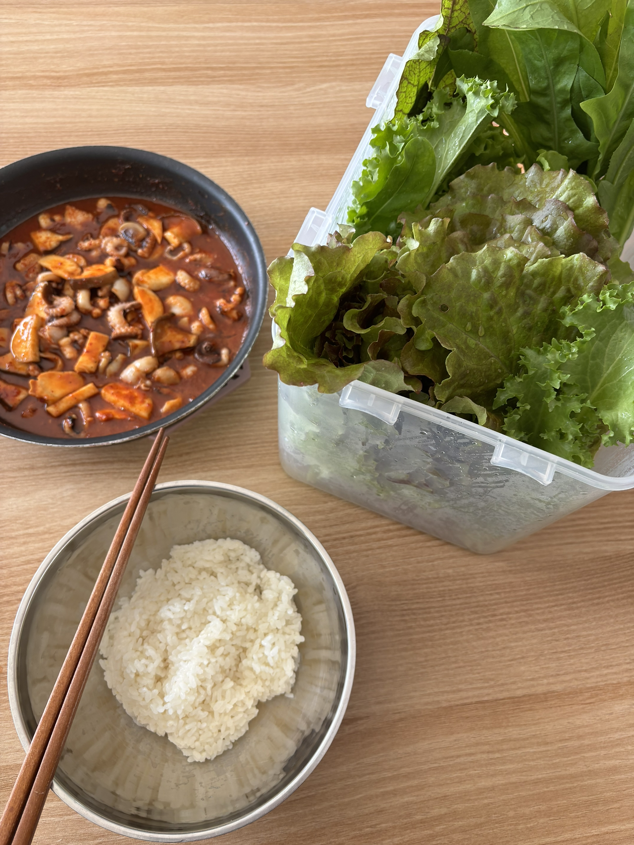 요리솜씨가 없어 반찬은 거의 인스턴트 아니면 밀키트다. 그래도 쌈을 좋아하는 편이라 거의 밥에 쌈, 약간의 고기를 구워 곁들이는 것이 주식이다. 입맛이 없을 땐 밀키트 주꾸미를 볶음을 애용하는데 쌈에도 잘 어울리는 음식이라 딱이다.