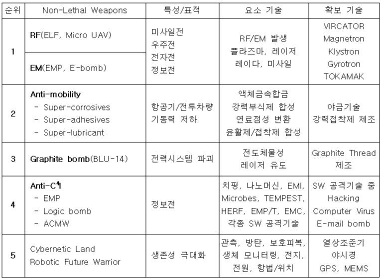 반면 아국의 전략 전술적 특정 요청에 부합하는 비살상 무기(기술)로써는, 첫째, 미사일전과 우주전의 중심적 무기체계인 유도무기 시스템의 핵심부품인 광학 전자 센서들을 파괴시킬 수 있는 전자․광학․전자파 무기와 기술을 이용한 RF 및 EM 무기, 둘째, 동력 엔진기관의 무력화, 연료 고화, 윤활체 또는 강력 점착 발포체를 사용하여 기동 및 비행 특성을 제어함으로써 항공기 및 전투차량의 기동성을 감속시키는 기동성 저하형 무기체계 및 기술을 이용한 대기동성(anti-mobility) 무기, 셋째, 전․평시를 막론하고 국가체제의 가장 필수적인 기반산업의 중추적 역할을 뒷받침하는 전력시설을 파괴하고 마비시키는 대기간시설용 비살상 무기인 흑연폭탄, 넷째, 21세기의 전쟁을 특징 지우는 전자전과 정보전의 핵심인 C4I체계를 무력화시키는 대 C4I 시스템용 비살상무기인 하드웨어 및 소프트웨어 공격용 무기, 다섯째, 전쟁에서 가장 중요한 전투원 개개인의 생존성을 높여주는 병사체계 또는 로봇병사 시스템(Robotic Future Warrior)을 들 수 있다.