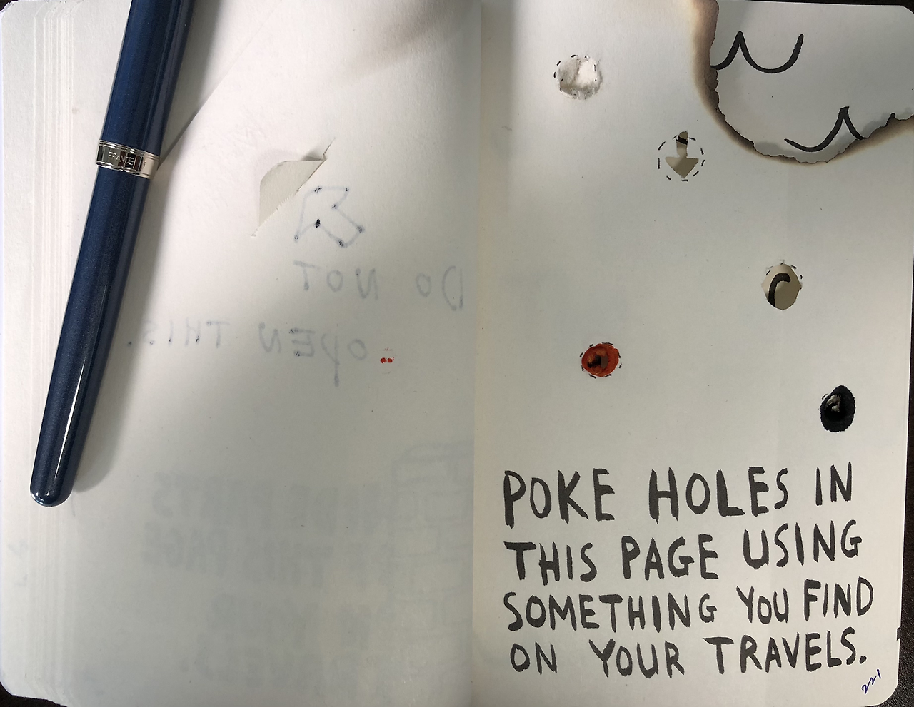 Wreck this Jounal 2일차, 여행 중 발견한 것을 사용해서 이 페이지에 구멍을 뚫어라! 가스라이터로 종이를 살짝 태워서 구멍을 내려다가 실패하고 종이를 다 태울 뻔 했다. 만년필, 나뭇가지, 가위, 칼, 마커펜으로 나머지에 구멍을 냈다. 동료들이 내가 점점 이상한 행동을 한다고 웃는다. 나도 길에 떨어진 나뭇가지를 주워서 책에 구멍을 뚫는 내 모습이 우스꽝스럽다. 이것이 보다 창의적인 사람이 되어가는 과정일까?