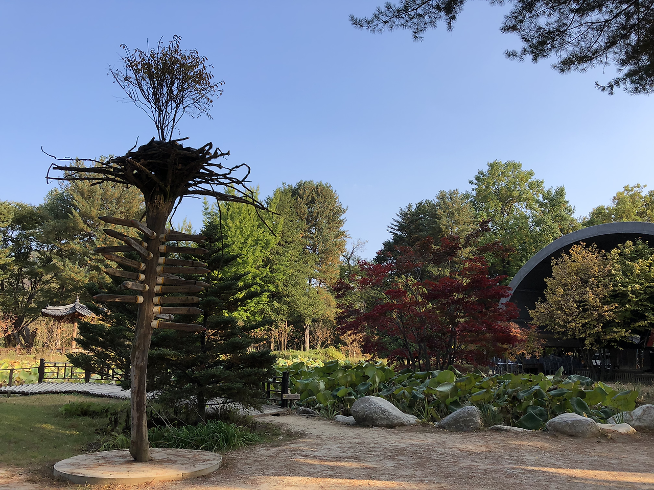 우리 팀은 유유자적 남이섬의 산책로를 따라 가을 정취를 만끽했다. 오랜만의 야외 나들이에 시원한 갈바람이 부는 맑은 날씨까지 여행하기 딱 좋은 날이었다. 남이섬은 넓은 공간에 각종 수목림이 조성되어 있고 제법 많은 볼거리를 갖추고 있다. 심지어 공원 내부에 숙박시설과 식당과 카페와 찻집과 매점이 있어서 연인이나 친구 또는 가족끼리 1박 2일 코스로도 제격이다. 인생 샷을 찍을만한 포토존도 여러 곳에 산재해 있다. 마스크를 벗을 수만 있다면 맑은 공기와 피톤치드를 흡입하기에 적합한 삼림이 있다. 휴식과 재충전하기에 만족스러운 공간이다.