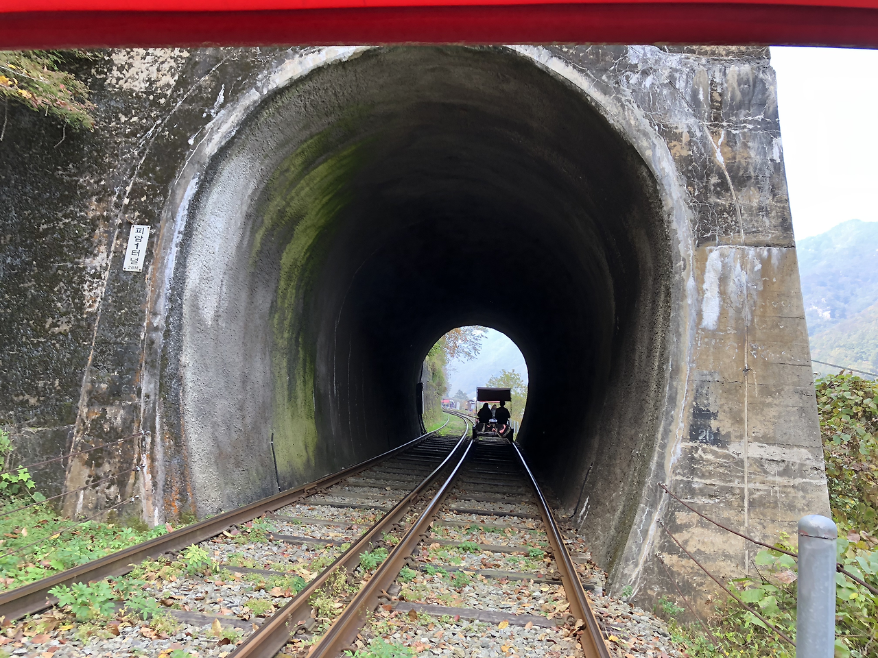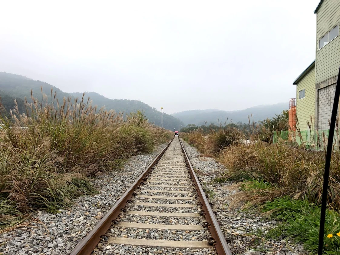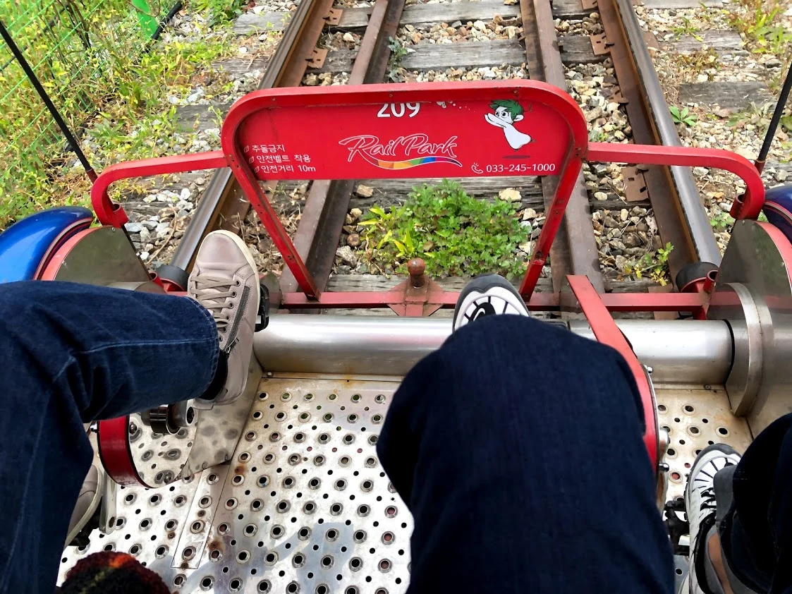 동심의 세계로 돌아가서 레일 바이크를 탔다. 아내도 흥에 겨워 힘차게 페달을 밟기 시작했다. 바이크가 달린다.
