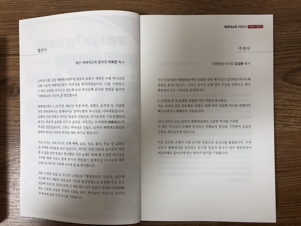 1월엔 시기를 맞추려고 서둘러 출간하다 보니 발간사, 추천사, 축사를 게재할 시간적 여유가 없었다. 하지만 성경구절을 써넣어서 오히려 더 임팩트가 있다는 생각도 든다. 국군 인쇄창에서 출판한 책은 저자의 원고를 인쇄창까지 보내는 과정에서 많은 시간이 소요됐다. 인터넷으로 전송한 메일이 인트라넷을 통해 해군본부 군종실과 보안성 검토 부서를 거쳐 인쇄창에 도달하기까지 2개월이 걸렸다. 하지만 시간이 지체된 만큼 내용을 수정하고 보완할 수 있는 여유를 얻었다.
