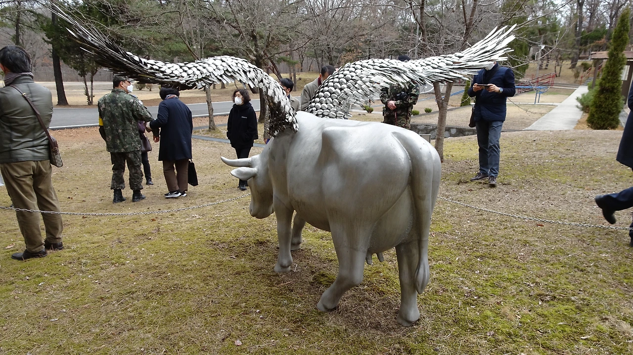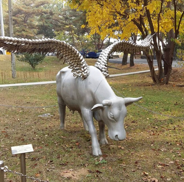 "한반도에 평화가 찾아오면 날아간다는 날개 달린 소, 엘사예요. 엘사의 날개는 왕스푼으로 만든 거예요."