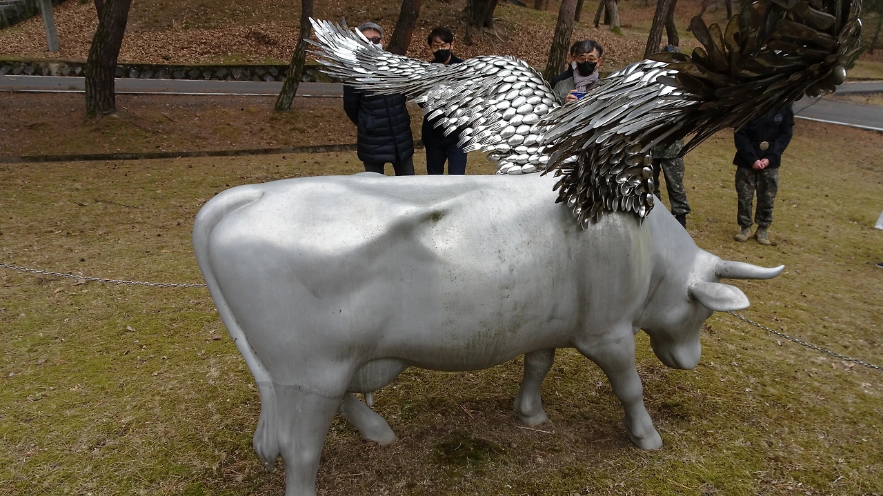 임 씨에게 맡겨진 것은 풀을 뜯는 형상의 소. "판문점에서 저는 자유를 떠올렸습니다. 소에게도 자유를 주자. 날개를 달기로 했습니다. 소는 우유와 노동력, 마지막에는 고기까지 제공합니다. 소에게 자신을 공격하는 인간을 되받아칠 수 있도록 포크와 나이프를 줬습니다."