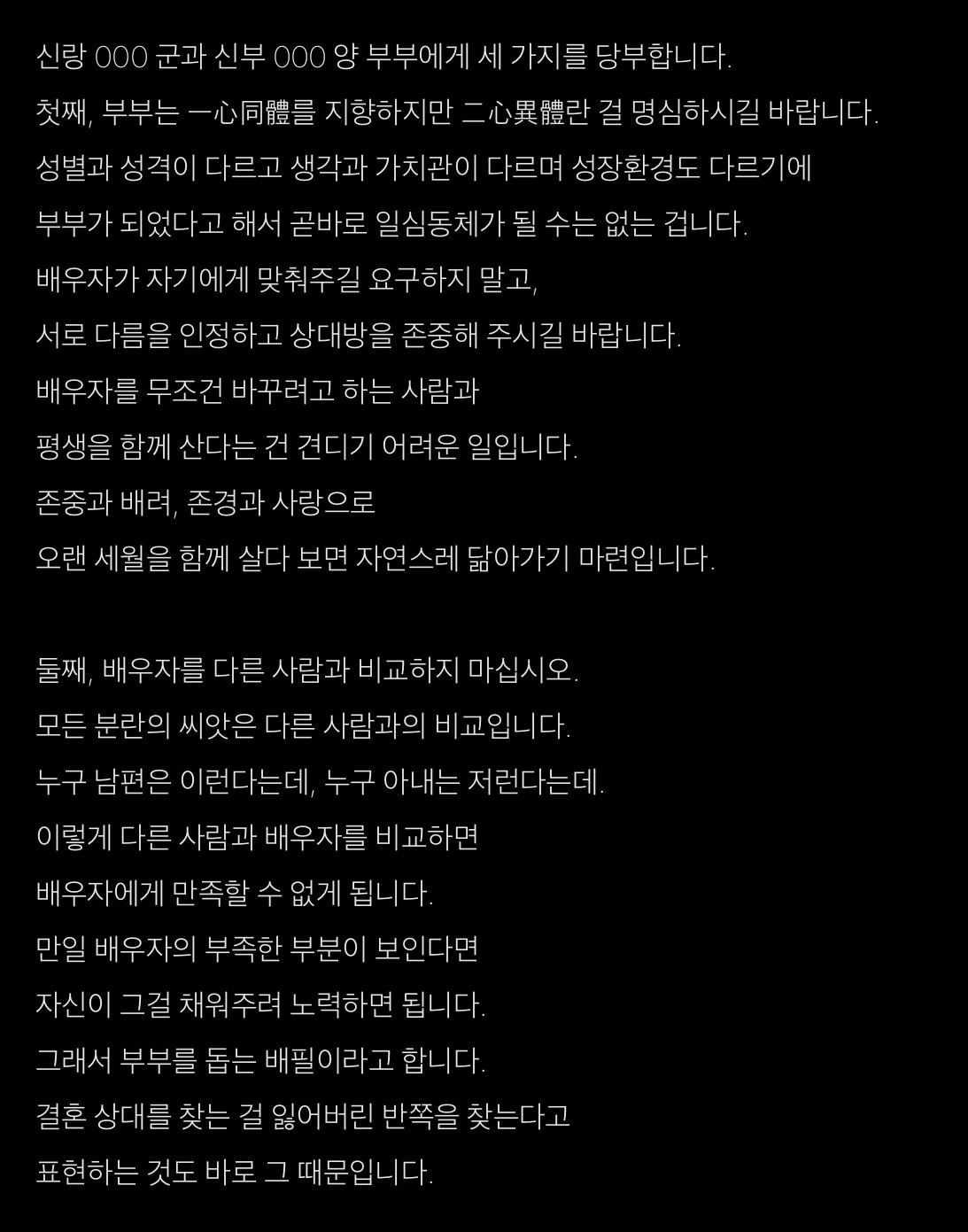 이젠 부부에게 공통적으로 당부할 말을 준비하면 된다. 인터넷 서핑을 다시 했다. "부부는 일심동체가 아니라 이심이체(二心異體)"란 말에 꽂혔다. 성격, 성별, 성장환경, 가치관 등이 다르기 때문에 일심동체가 될 수 없단 의미다. 당부의 말 한 꼭지가 만들어졌다. 세 가지 당부를 염두했으니 두 꼭지만 더 찾으면 된다. 부부싸움의 원인을 생각해봤다. 배우자를 남과 비교하다 보니 만족하지 못하고, 그게 증폭되면 갈등이 생긴다. 핵가족화로 시들해져 가는 부모 공경에 대한 얘기도 하면 좋을 듯했다. 드디어 신혼부부 두 사람 모두에게 당부할 세 꼭지가 정해졌다. 일필휘지로 주례사를 썼다.