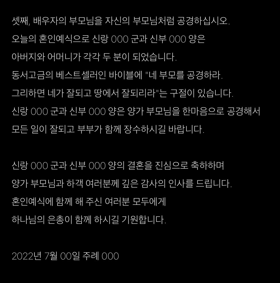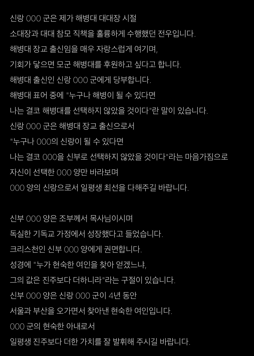 신랑 신부에게 무슨 말을 할까 곰곰이 생각했다. 신랑은 해병대 장교 출신이고 신부는 독실한 크리스천이란 걸 강조하기로 했다. "누구나 해병이 될 수 있다면 나는 결코 해병대를 선택하지 않았을 것이다"란 해병대 표어에 신부 이름을 넣어 신랑에게 당부하면 좋을 것 같았다. "누구나 000의 신랑이 될 수 있다면 나는 결코 000을 신부로 선택하지 않았을 것이다." 신부에겐 결혼이나 부부와 관련된 성경 구절을 인용해서 권면의 말을 하기로 했다. "누가 현숙한 여인을 찾아 얻겠느냐? 그의 값은 진주보다 더 하니라"라는 구절이 마음에 닿았다.