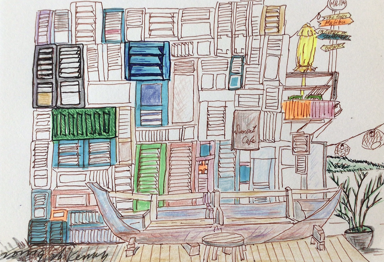 스카이 블루 색감이 눈에 띄었다. 만년필로 밑그림을 그리고 수용성 색연필로 색을 입히고 형광펜으로 덧칠을 했다.