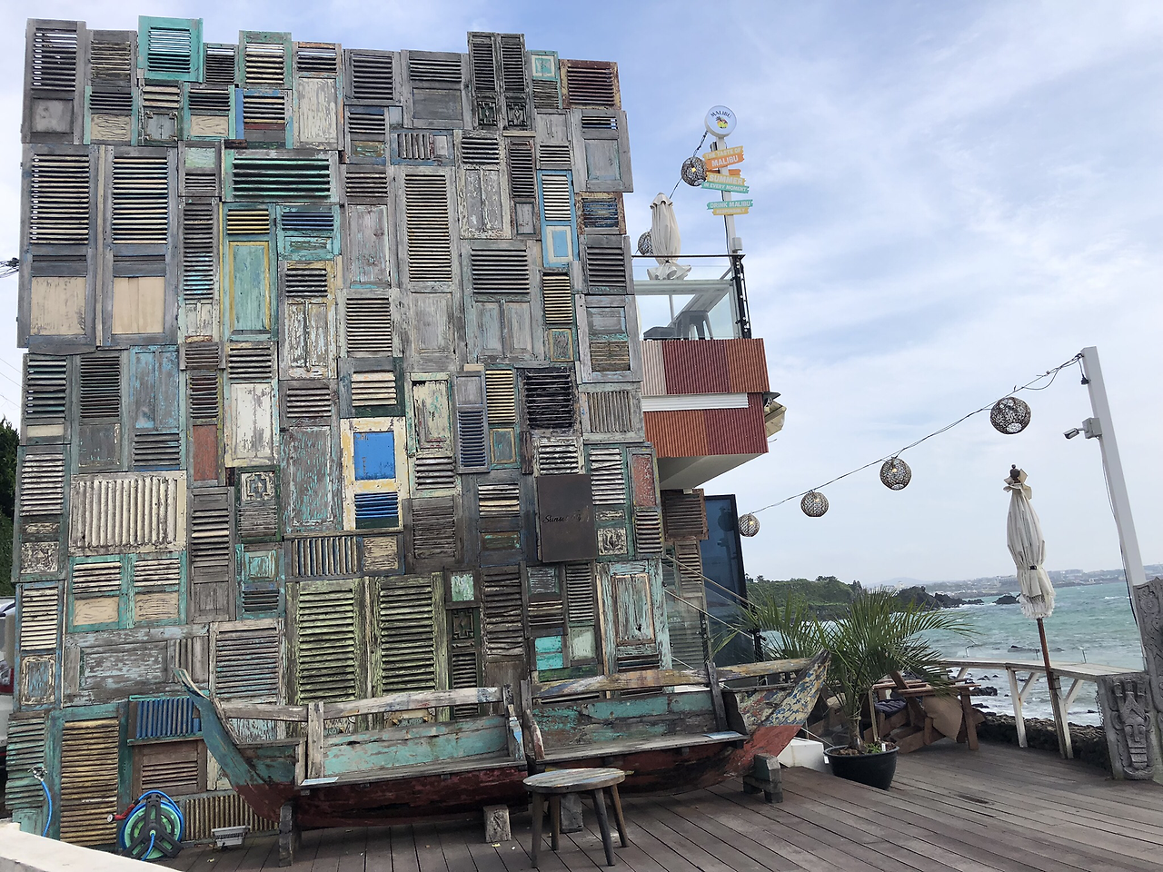 오늘은 제주 여행 때 들렀던 카페 사진을 보고 그림을 그렸다. 이 카페는 외부 벽면을 여러 형태의 문으로 장식했다.