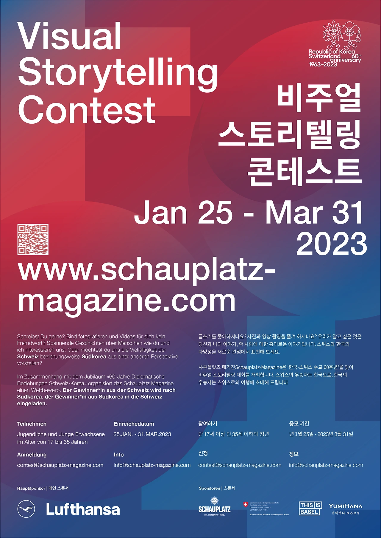 군 복무 시절 함께 근무했던 스위스 장교 출신 친구가 대표로 있는 회사(서울)에서 개최하는 한국-스위스 수교 60주년 기념 이벤트입니다. 글쓰기나 사진 촬영을 좋아하는 학생이나 청년 작가분들에게 콘테스트 참여를 권합니다. 스위스 우승자에게는 한국 여행, 한국 우승자에게는 스위스 관광 기회를 제공한다는군요. 스위스 여행을 할 수 있는 절호의 찬스를 놓치지 마세요. 도전해 봐야 성취감도 느낄 수 있잖아요?