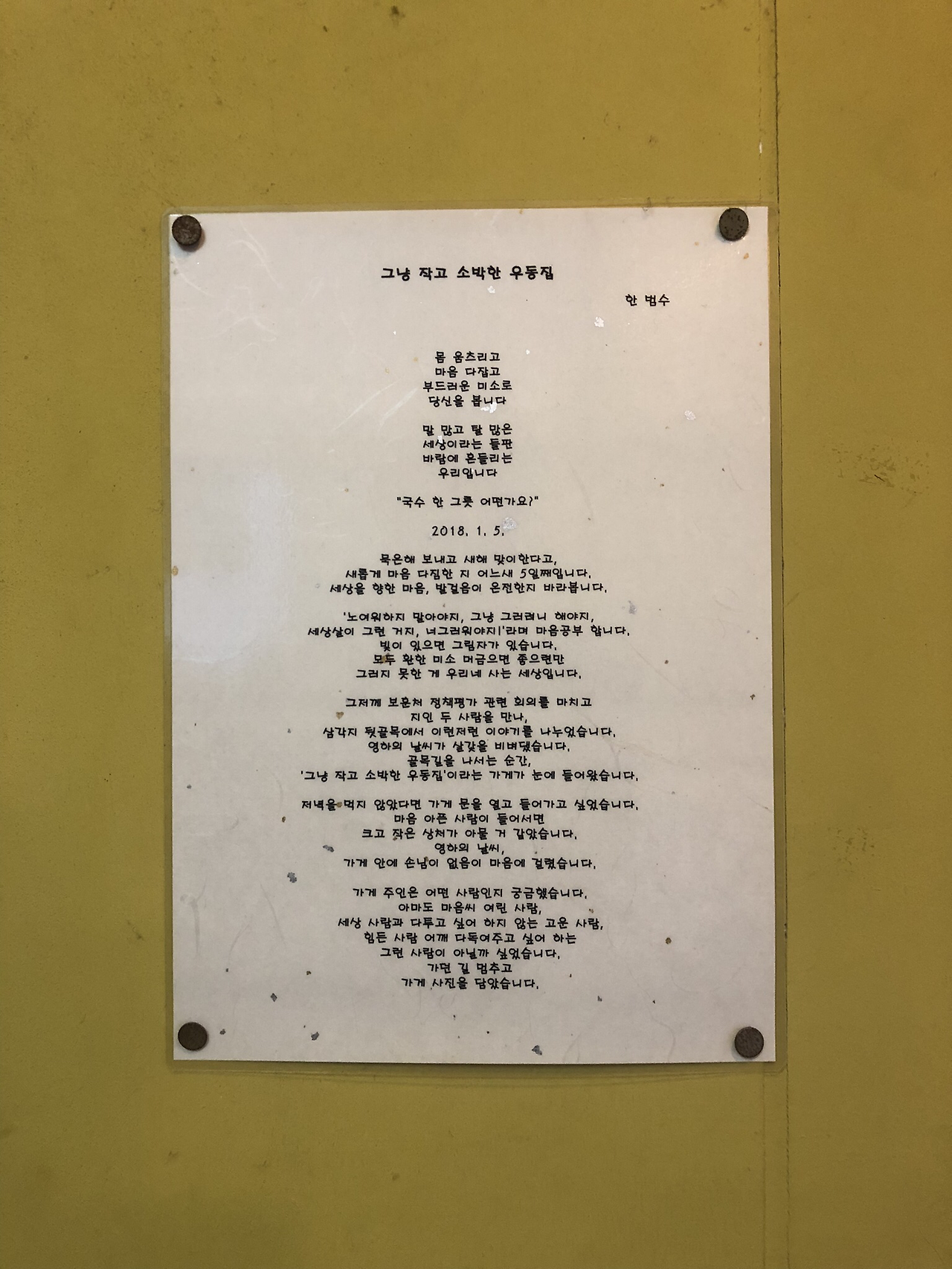 사장님, 음악 소리가 괜찮은데요. 네, CBS 라디오 방송인데 라디오가 스피커 전문회사 000 제품이에요. 낡아 보이는 라디오의 음향이 정말 좋았다. 그냥 작고 소박한 우동집의 그냥 작고 소박한 라디오에서 들려오는 노래가 쌓인 피로를 풀어줬다. 한쪽 벽면에는 그냥 작고 소박한 우동집이라는 시가 있었다.