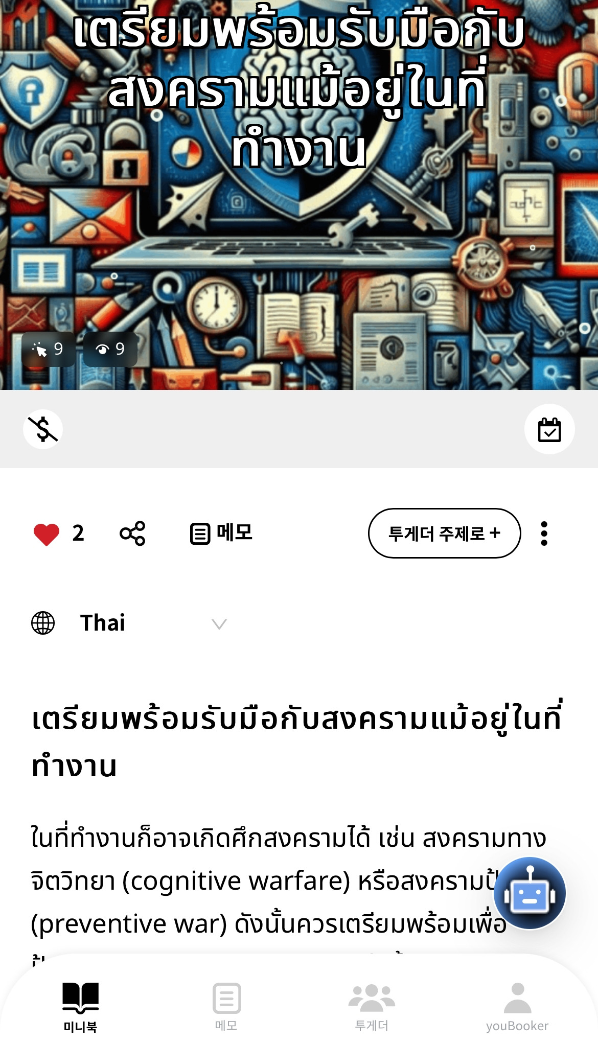 브런치에 비해 상대적으로 아쉬운 건 사진을 포함한 3쪽 이상의 글을 써야만 미니북이 발간된다. 작가로 선정되지 않아도 회원 가입만 하면 미니북을 출간할 수 있다. 브런치와 유북을 적절하게 활용해야겠다. 유북에서 만든 미니북의 태국어, 중국어, 러시아어 번역본 일부분을 소개한다.
