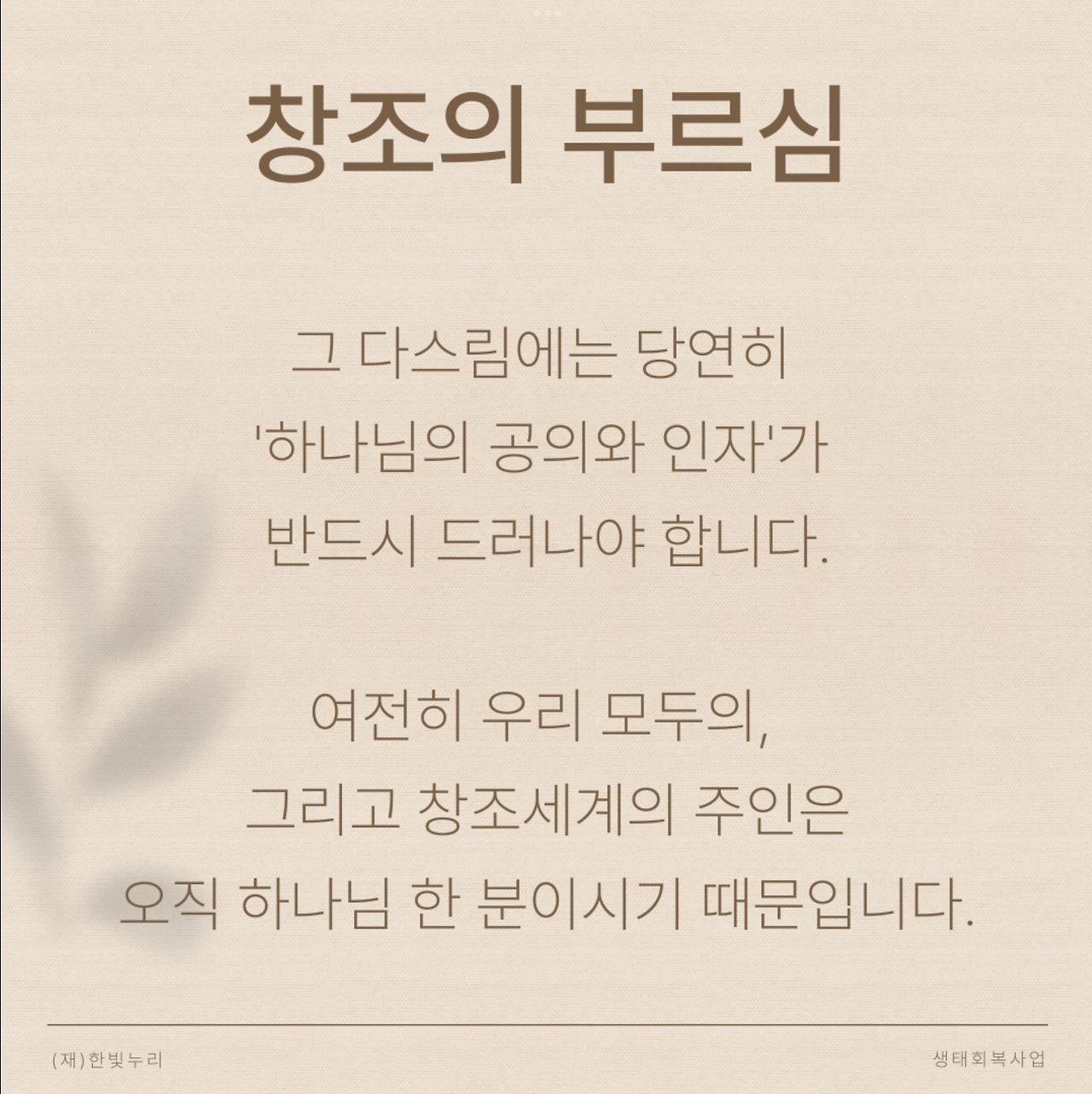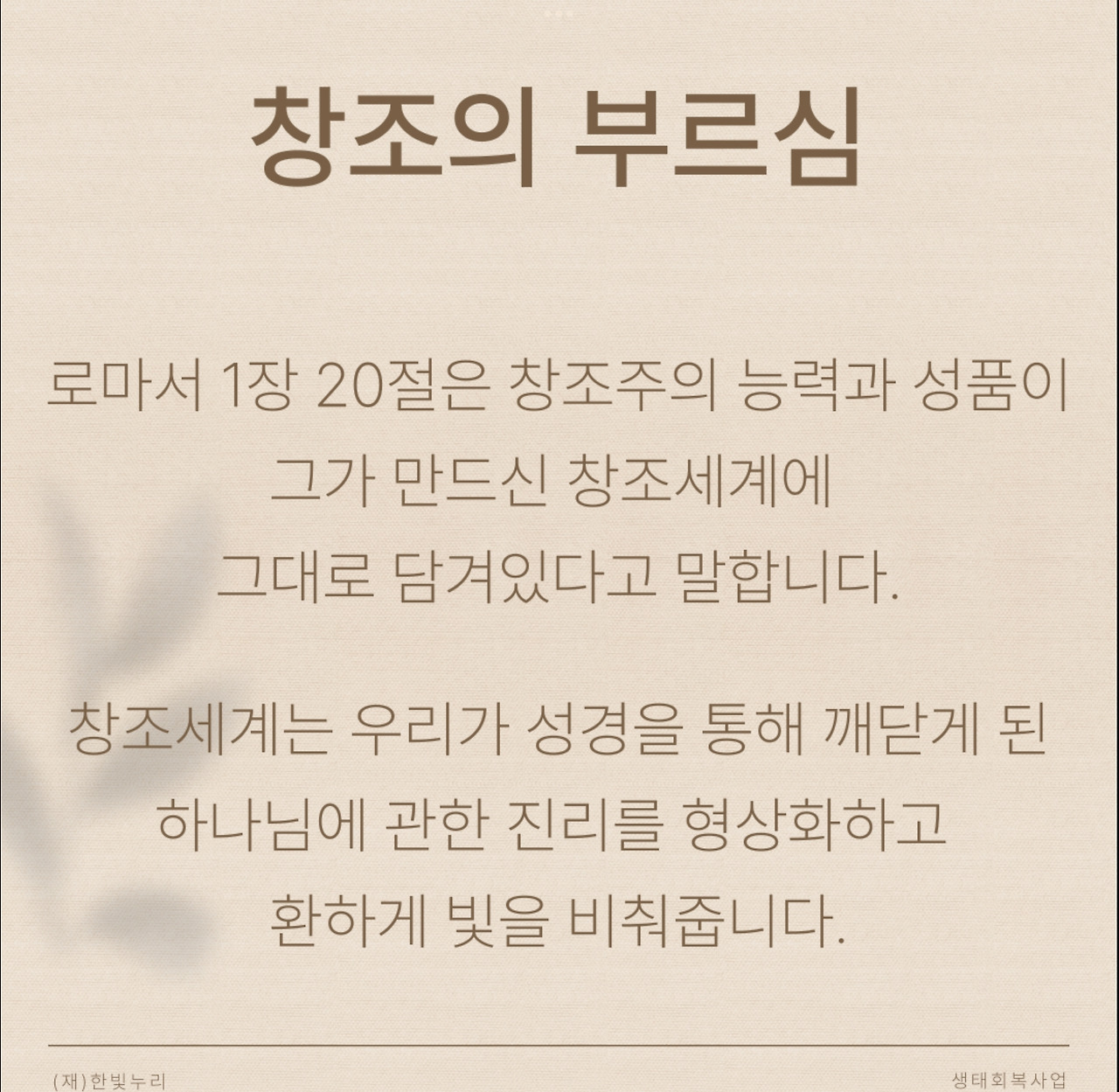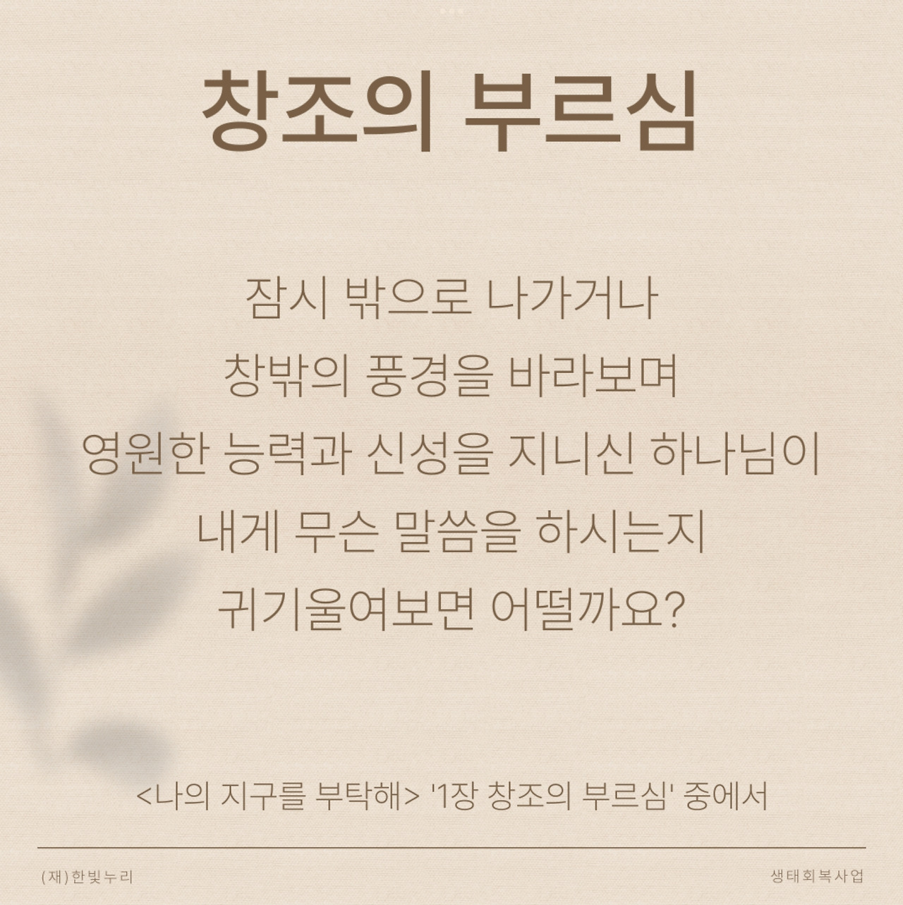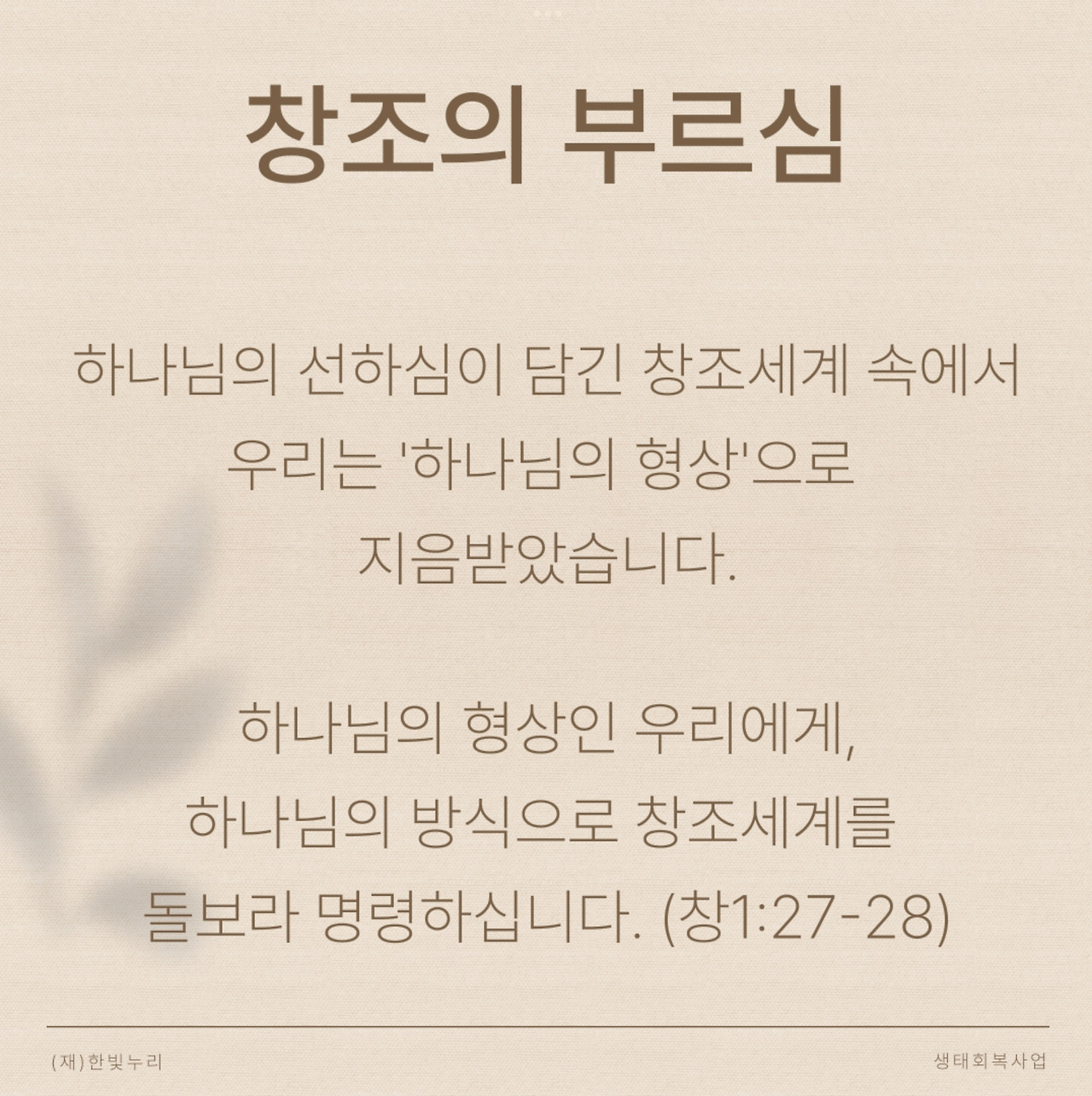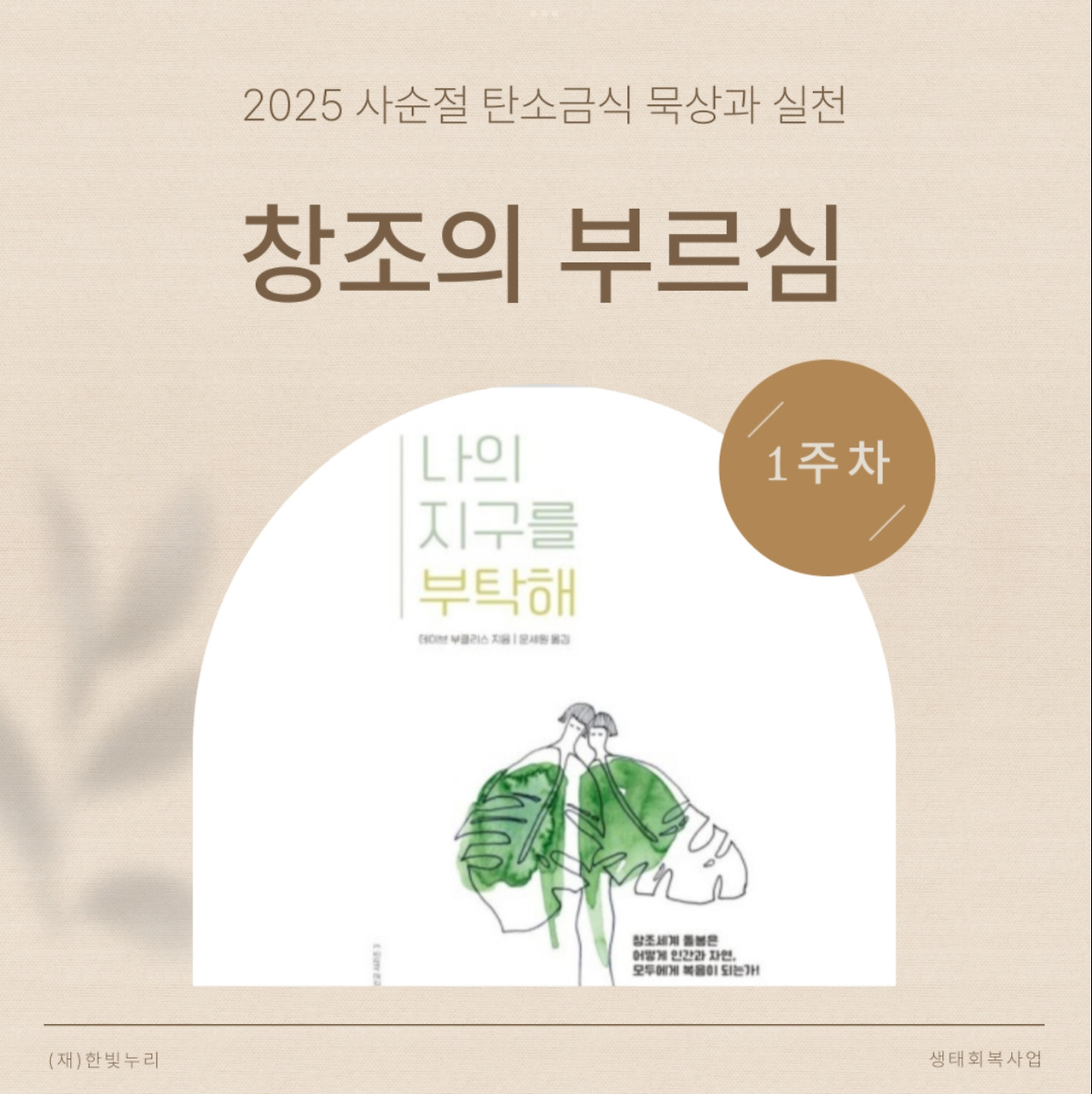 “나의 지구를 부탁해”라는 대주제 아래 1주 차 주제는 “창조의 부르심”이다. 창조주의 능력과 성품은 그가 만드신 창조세계에 그대로 담겨 있다. 창조세계는 우리가 성경을 통해 깨닫게 된 하나님에 관한 진리를 형상화하고 환하게 빛을 비춰준다. 하나님의 선하심이 담긴 창조세계 속에서 우리는 하나님의 형상대로 지으심을 받았다. 하나님의 형상인 우리에게 하나님의 방식으로 창조세계를 돌보라고 명령하신다. 그 다스림에는 하나님의 공의와 인자가 반드시 드러나야 한다. 우리 모두와 창조세계의 주인은 하나님 한분이시기 때문이다.