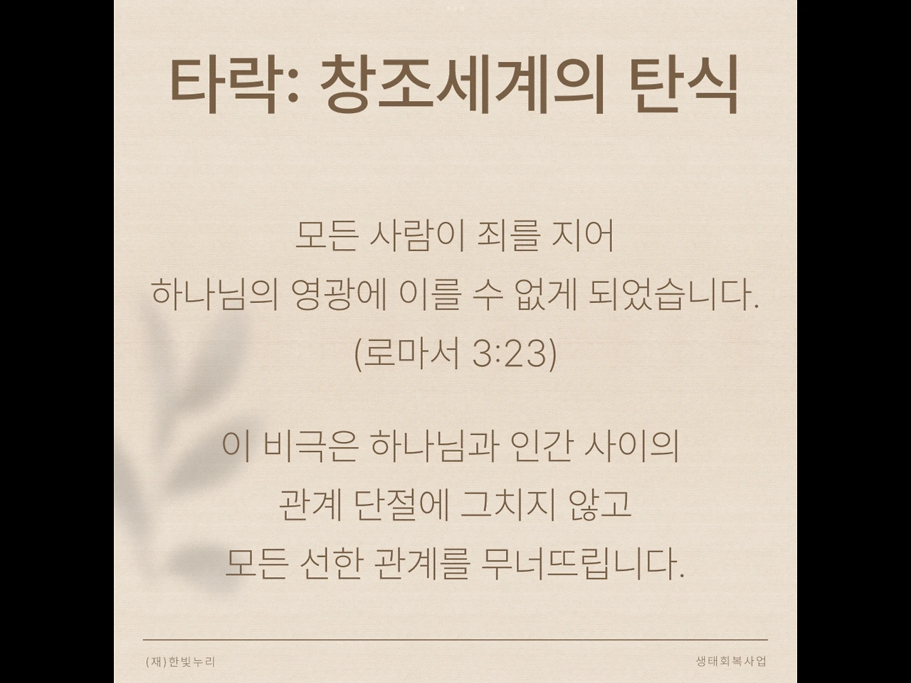 모든 사람이 죄를 지어 하나님의 영광에 이를 수 없게 되었습니다. 이 비극은 하나님과 인간 사이의 관계 단절에 그치지 않고 모든 선한 관계를 무너뜨립니다.