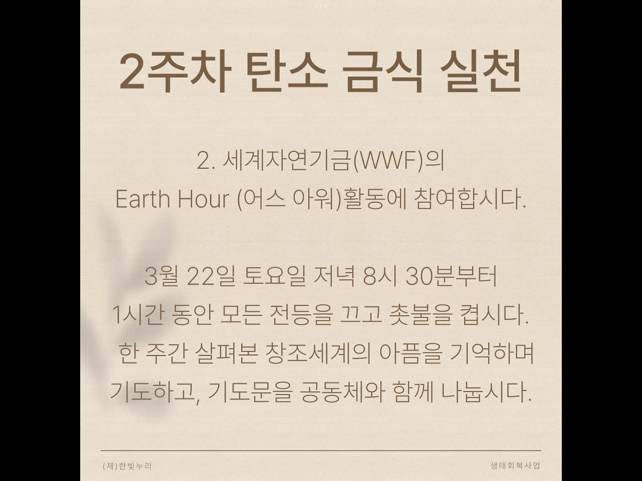 3월 22일 토요일 저녁 8시 30분부터 1시간 동안 모든 전등을 끄고 촛불을 켭시다. 한 주간 살펴본 창조세계의 아픔을 기억하며 기도하고, 기도문을 공동체와 함께 나눕시다.