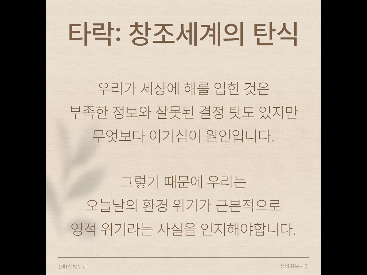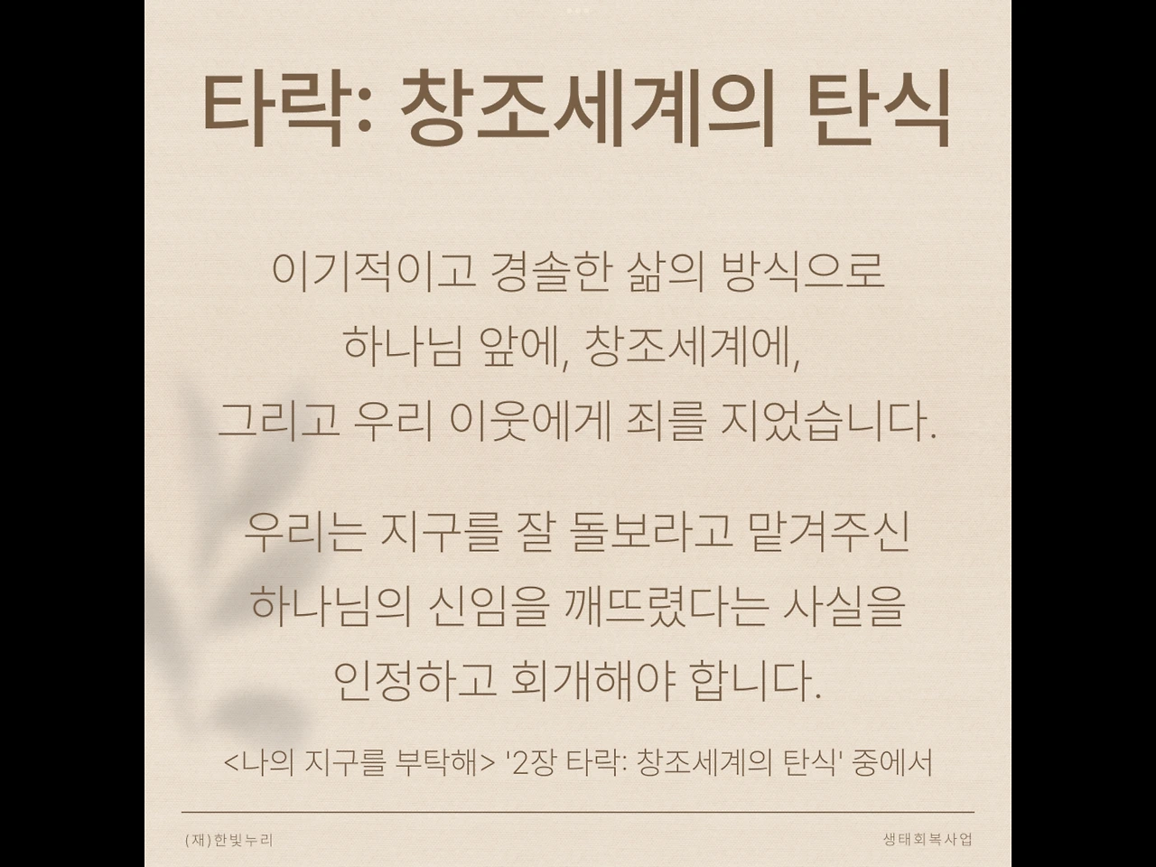 우리가 세상에 해를 입힌 것은 부족한 정보와 잘못된 결정 탓도 있지만 무엇보다 이기심이 원인입니다. 그렇기 때문에 우리는 오늘날의 환경 위기가 근본적으로 영적 위기라는 사실을 인지해야 합니다.