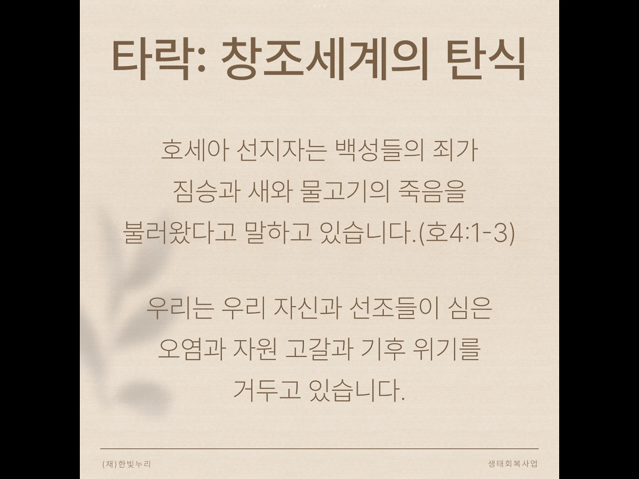 호세아 선지자는 백성들의 죄가 짐승과 새와 물고기의 죽음을 불러왔다고 말하고 있습니다. 우리는 우리 자신과 선조들이 심은 오염과 자원 고갈과 기후 위기를 거두고 있습니다.