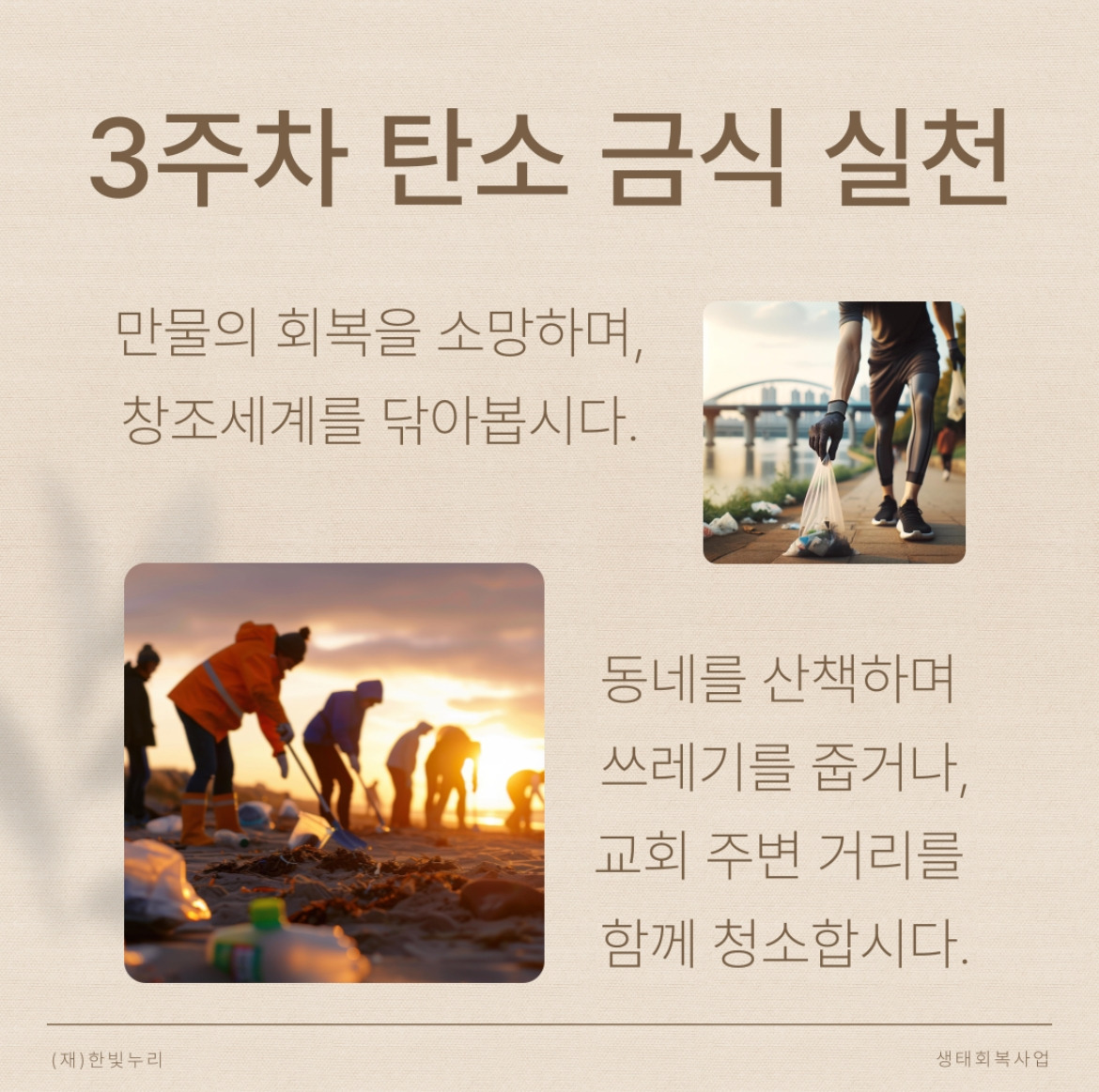 사순절 탄소금식 묵상과 실천 3주 차 주제는 “예수, 그리고 새 하늘과 새 땅”이다. 지난주엔 토요일 저녁 8시 30분에 집 안의 모든 전등을 끄는 활동에 동참했다. 미력하나마 사순절 탄소금식으로 지구를 살리는 일에 동참했다는 기쁨이 있었다. 이번 주엔 동네를 산책하며 휴지를 주워보자.