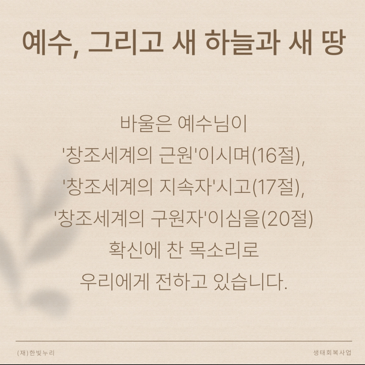 바울은 예수님이 ‘창조세계의 근원’이시며 ‘창조세계의 지속자’시고 ‘창조세계의 구원자’이심을 확신에 찬 목소리로 우리에게 전하고 있습니다.