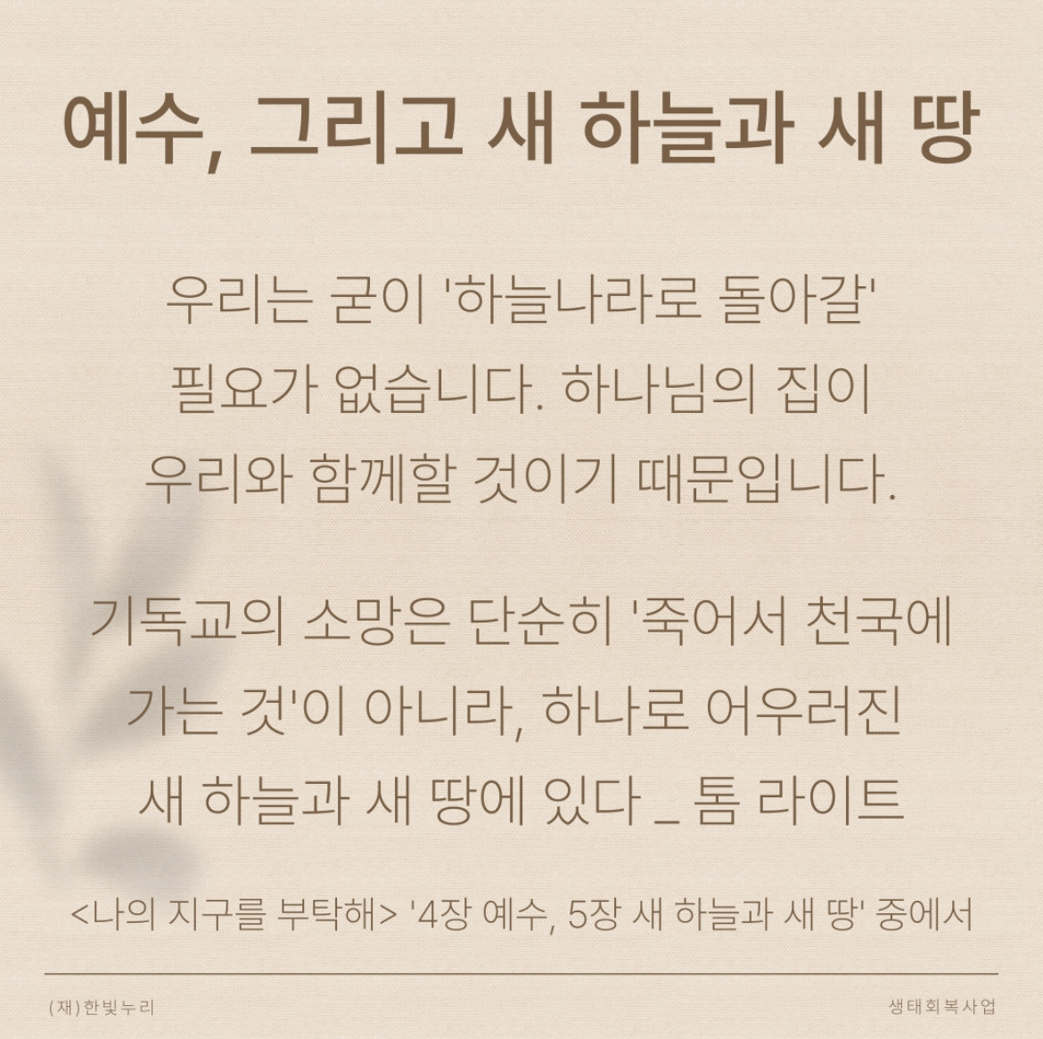 “기독교의 소망은 단순히 죽어서 천국에 가는 것이 아니라, 하나로 어우러진 새 하늘과 새 땅에 있다.” - 톰 라이트