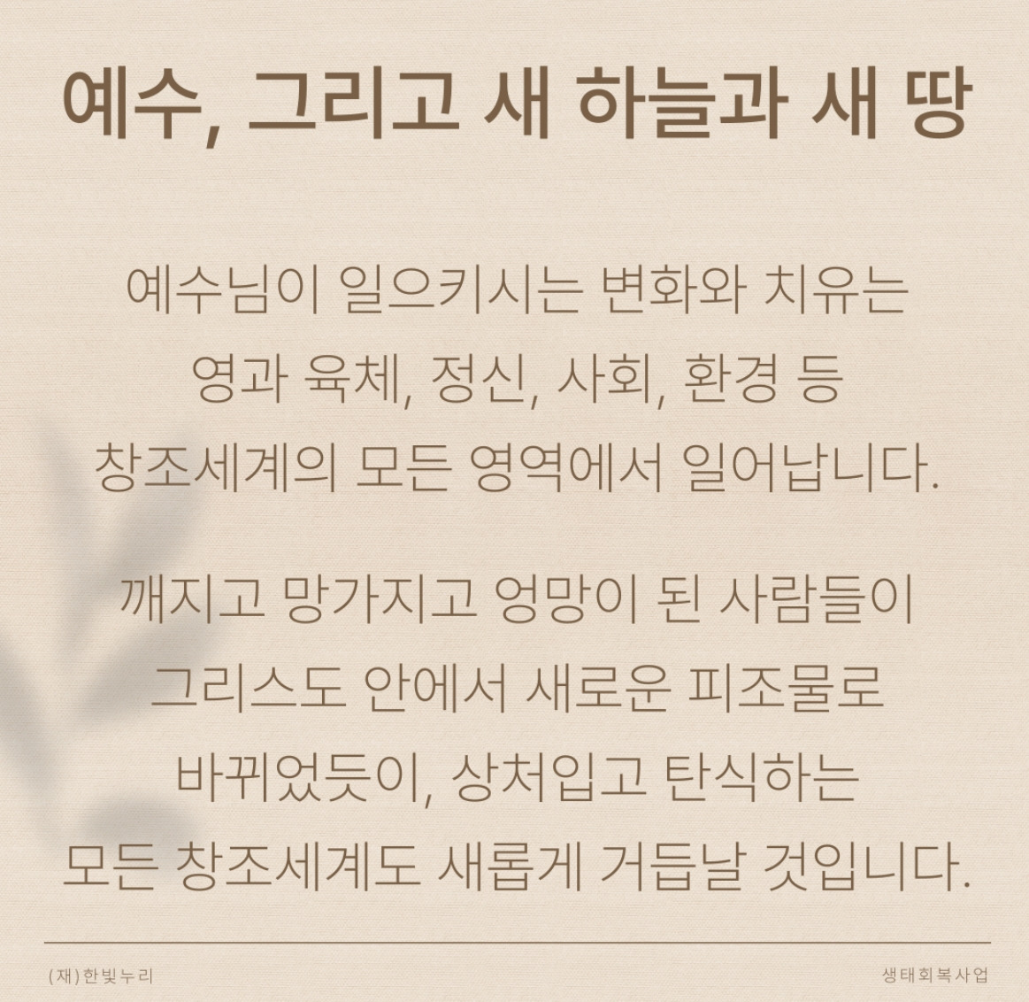 예수님이 일으키시는 변화와 치유는 영과 육체, 정신, 사회, 환경 등 창조세계의 모든 영역에서 일어납니다. 깨지고 망가지고 엉망이 된 사람들이 그리스도 안에서 새로운 피조물로 바뀌었듯이, 상처 입고 탄식하는 모든 창조세계도 새롭게 거듭날 것입니다.