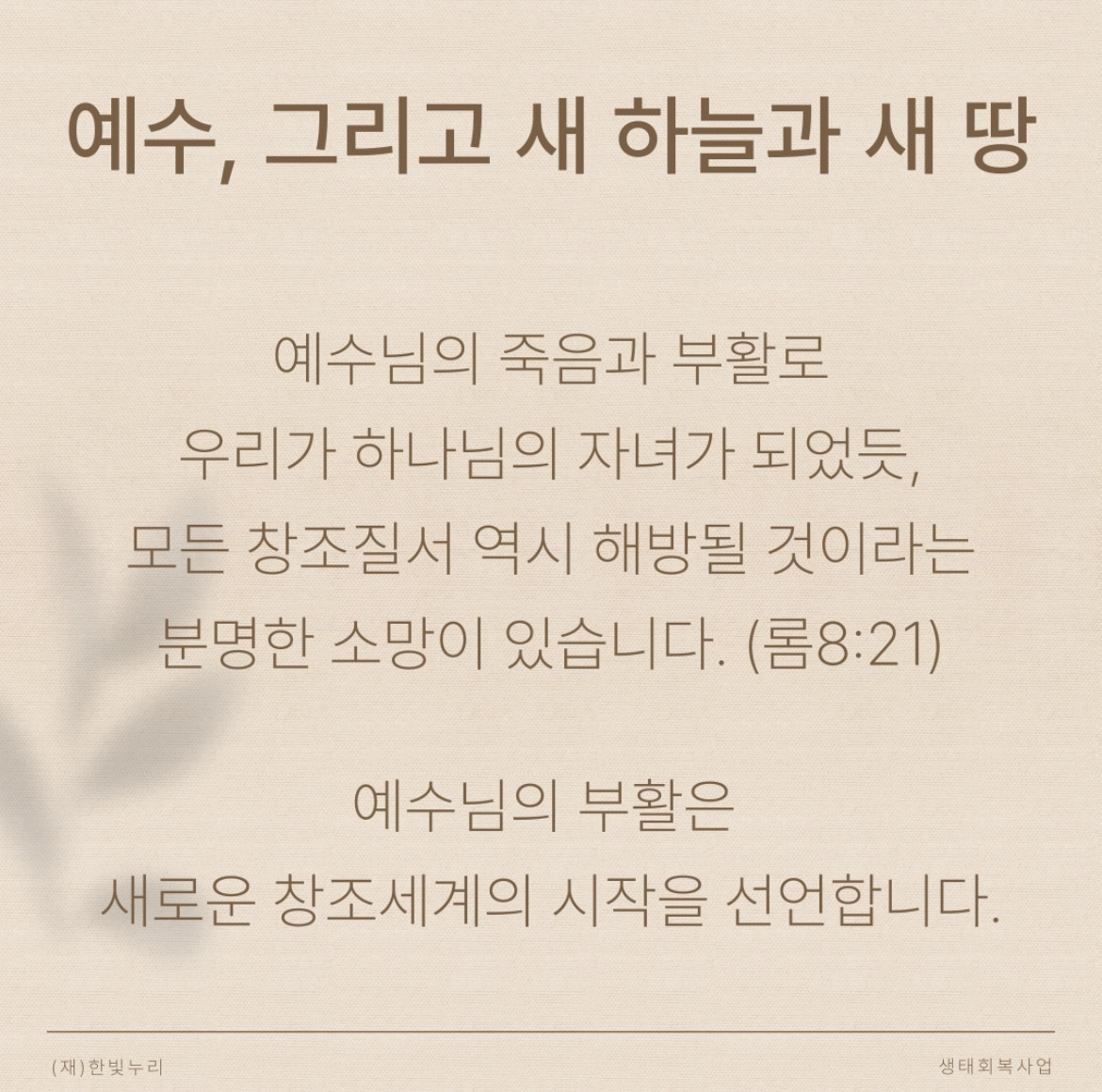 예수님의 죽음과 부활로 우리가 하나님의 자녀가 되었듯, 모든 창조질서 역시 해방될 것이라는 분명한 소망이 있습니다. 예수님의 부활은 새로운 창조세계의 시작을 선언합니다.