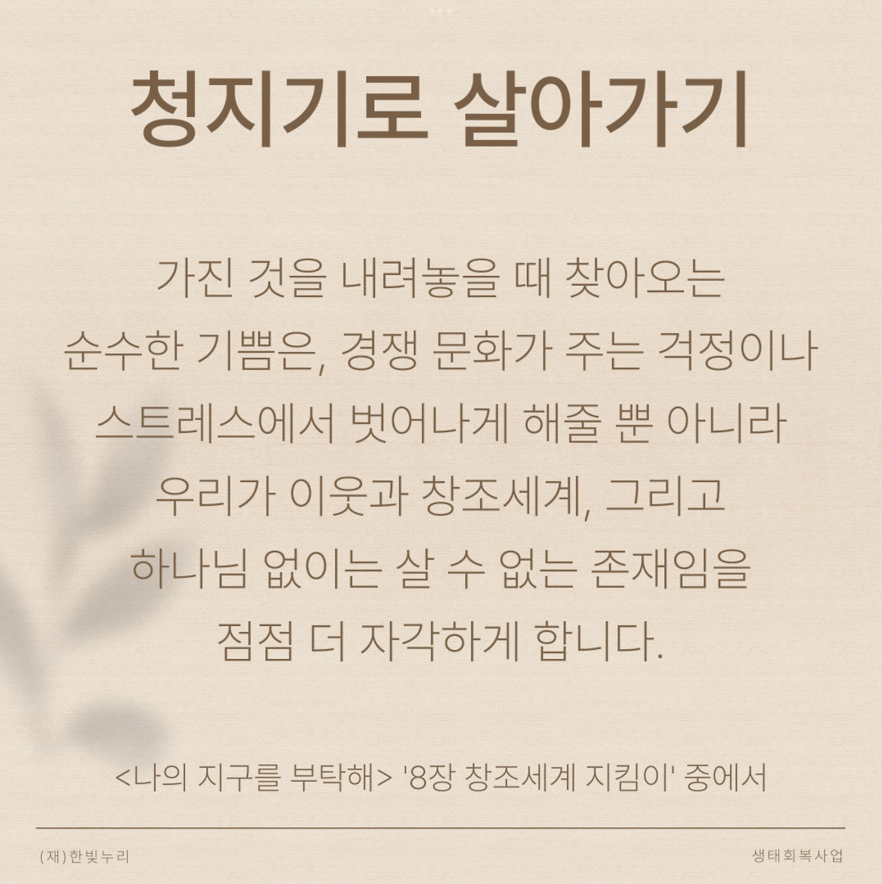 가진 것을 내려놓을 때 찾아오는 순수한 기쁨은, 경쟁 문화가 주는 걱정이나 스트레스에서 벗어나게 해 줄 뿐 아니라 우리가 이웃과 창조세계, 그리고 하나님 없이는 살 수 없는 존재임을 점점 더 자각하게 합니다.