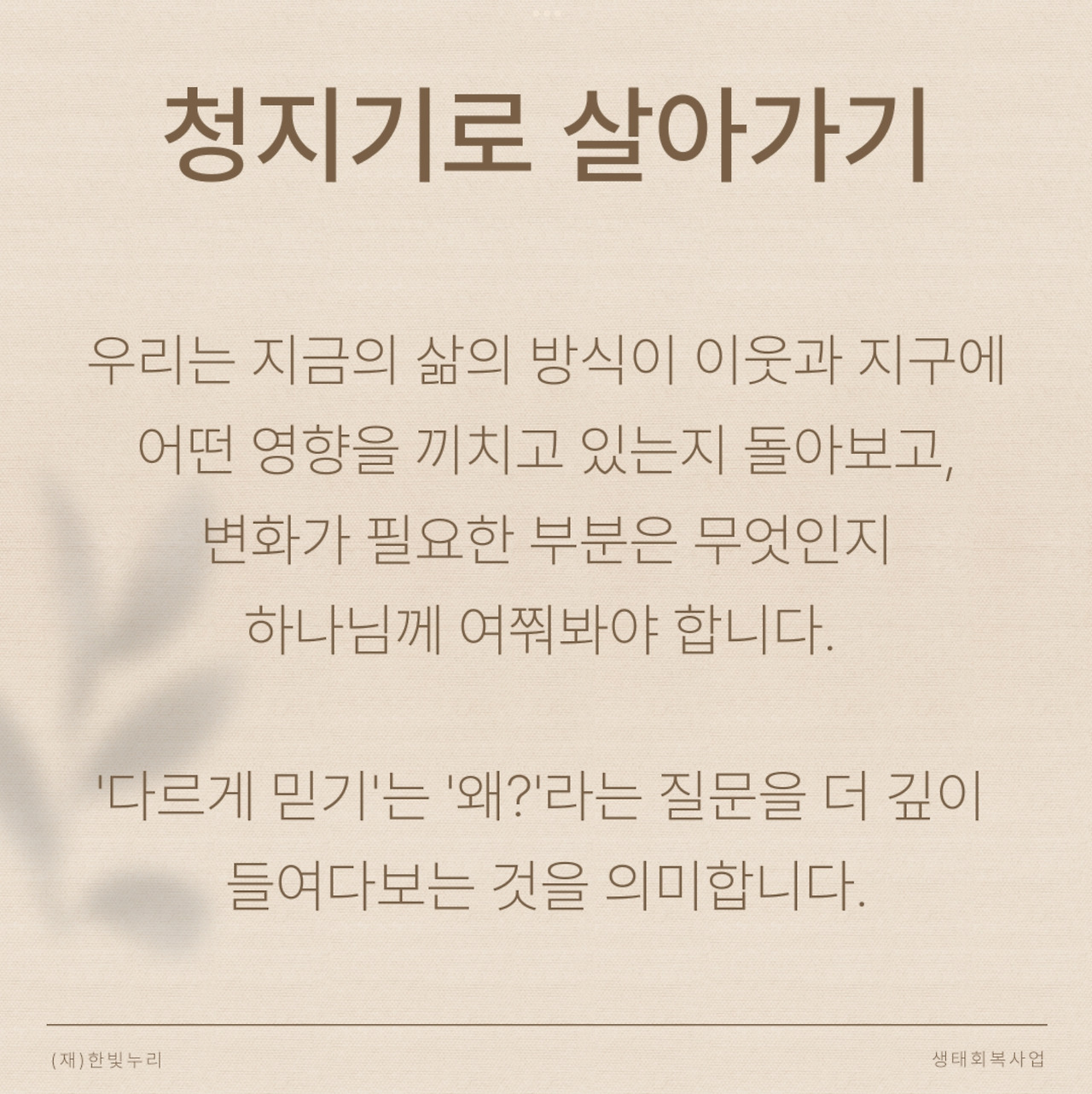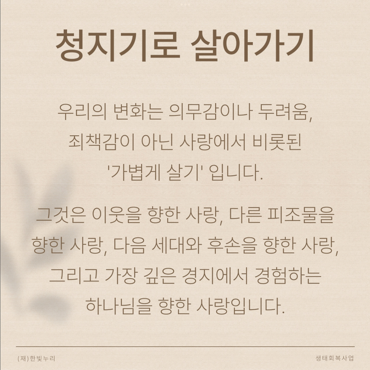 우리의 변화는 의무감이나 두려움, 죄책감이 아닌 사랑에서 비롯된 ‘가볍게 살기’입니다.