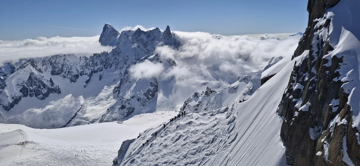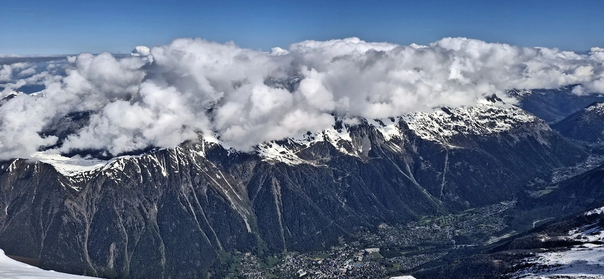 이때부터 문제가 발생했다. 파리에 도착해서 심한 기침감기에 걸렸던 터라 컨디션이 좋지 않았다. 약간의 어지럼증도 느껴졌다. 저혈압이 심한 아내는 더욱 심각했다. 호흡 곤란을 느낀다며 잠시 쉬자고 했다. 옆에서 쿵하는 소리가 나서 돌아보니 건장한 외국인 청년이 갑자기 뒤로 넘어졌다. Are you okay? 하며 청년이 메고 있던 큰 배낭을 벗기려고 했다. 그 청년이 괜찮다며 벌떡 일어났다. 다시 아내의 손을 잡고 함께 심호흡을 했다. 아내는 “이러다가 죽을 수도 있겠다”라는 생각까지 들었다고 나중에 얘기했다. 몽블랑의 장관을 보며 마지막을 상상하는 아이러니한 순간이었다. 자연의 위대함과 인간의 연약함이 대비되었다. 멀리서 설산에 오르는 산악인들의 행렬이 보였다. 인간의 한계에 도전하는 그들이 모습에 박수를 보낸다.