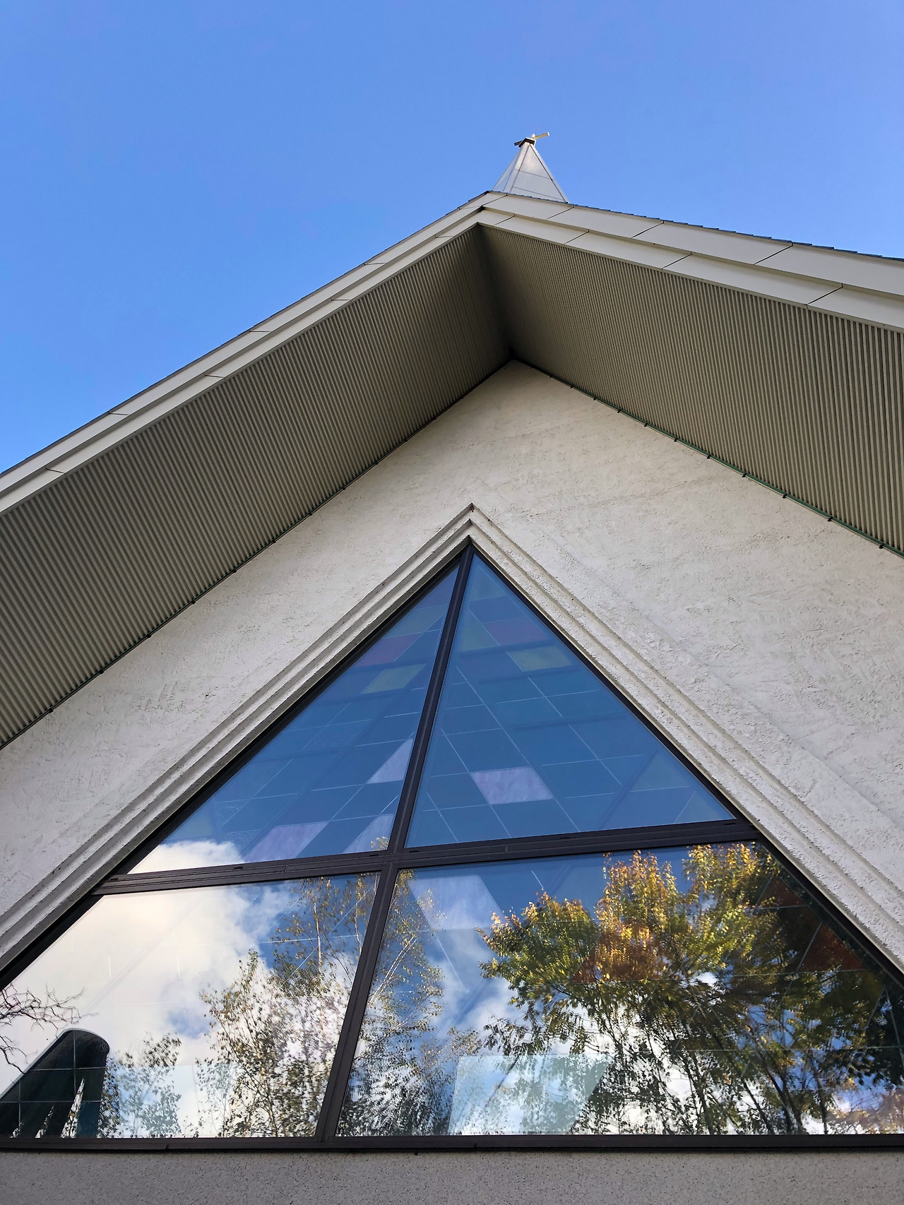 교회당 유리창에 비친 나뭇잎, 정말 아름다웠다.