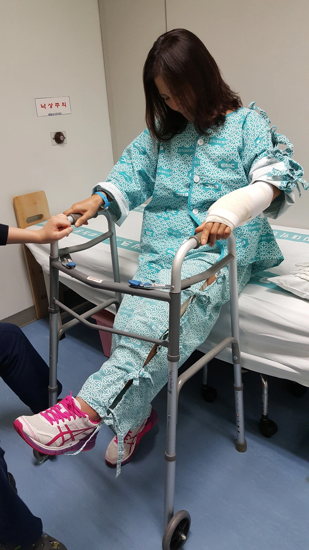 써니 님과 새털구름님이 하하하님과 함께 병실에 들어선다.