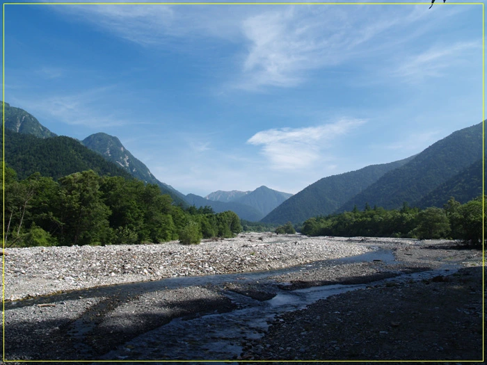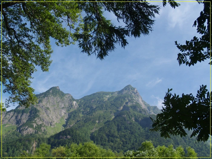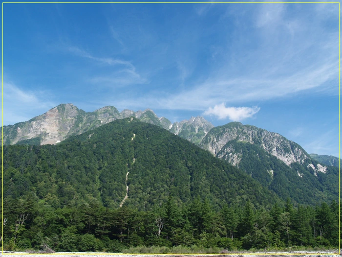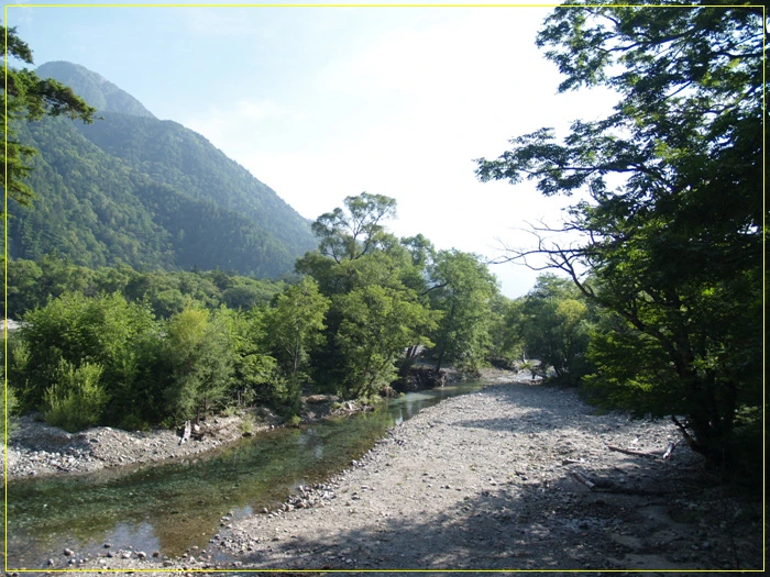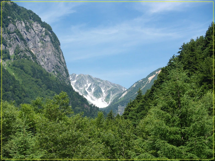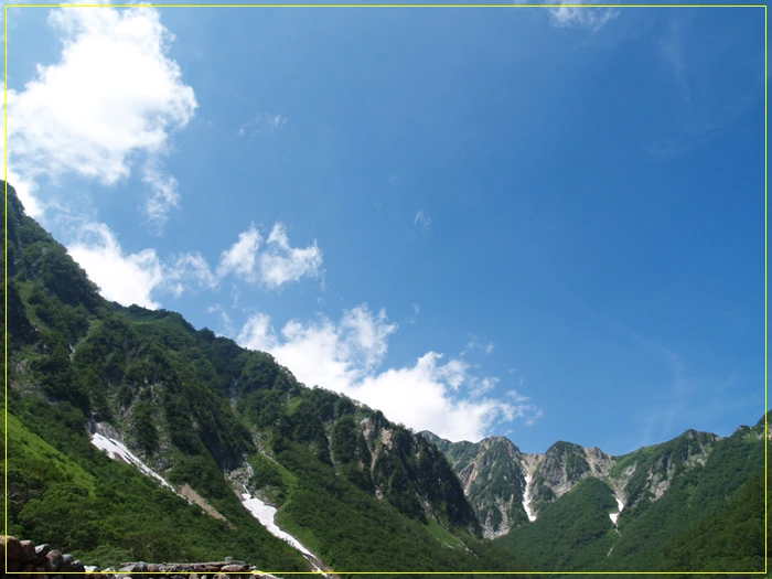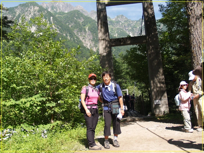 신무라바시교 정면으론 마에호다카와 기타오네의 능선이 웅장하다.