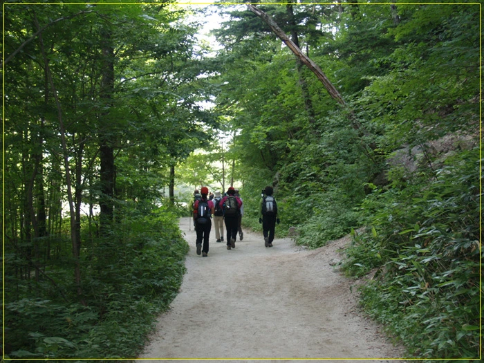 빼곡하고 전나무가 쭉쭉~ 뻗어있는 원시림이 완만하게 이어진 산책로라 힘든 줄 모른다.