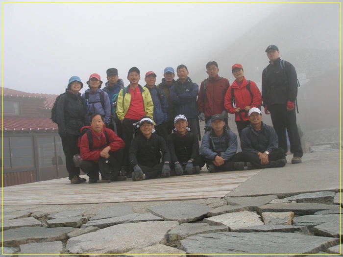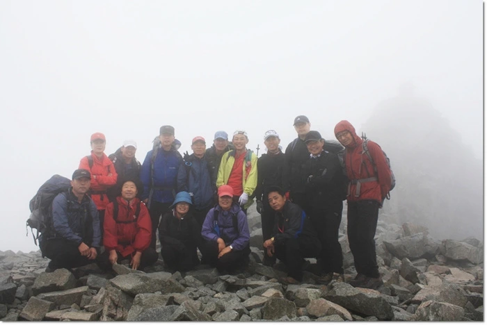 (오쿠호 다케 정상 단체 기념사진... 뒤에 흐릿한 정상이 보인다.)