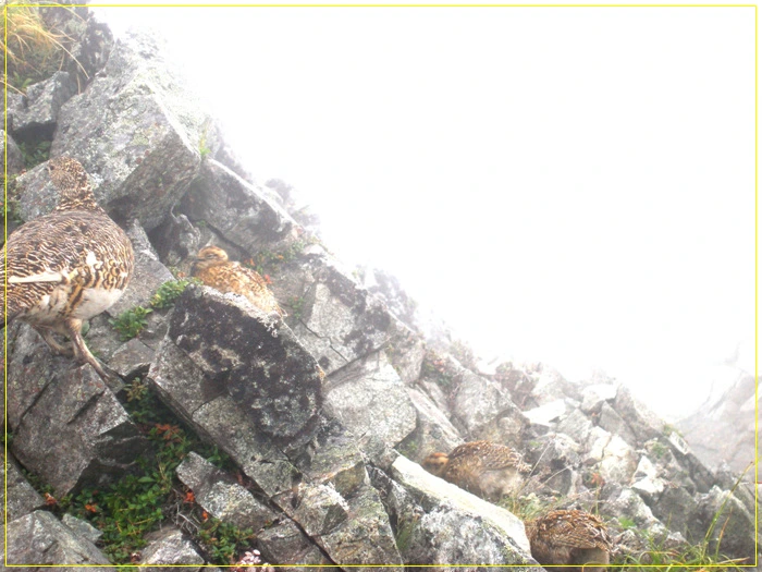 내리막길을 걷다 보니 마에호다카와 갈리는 기미코 히라의 능선엔 뇌조 일가족이 눈에 띈다.