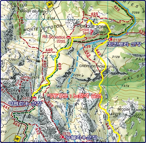산장뜰에서 보면 크로다 호수에서 저곳을 향한 등로가 실금을 긋고 올라서는 게 확인된다.