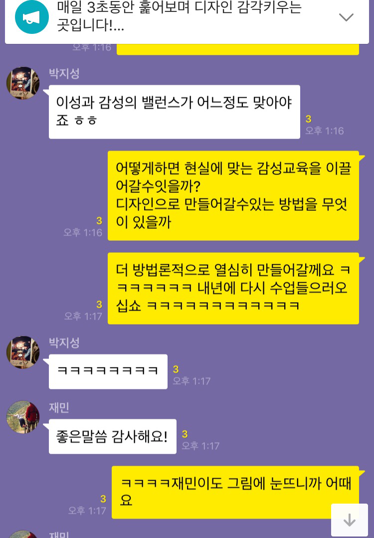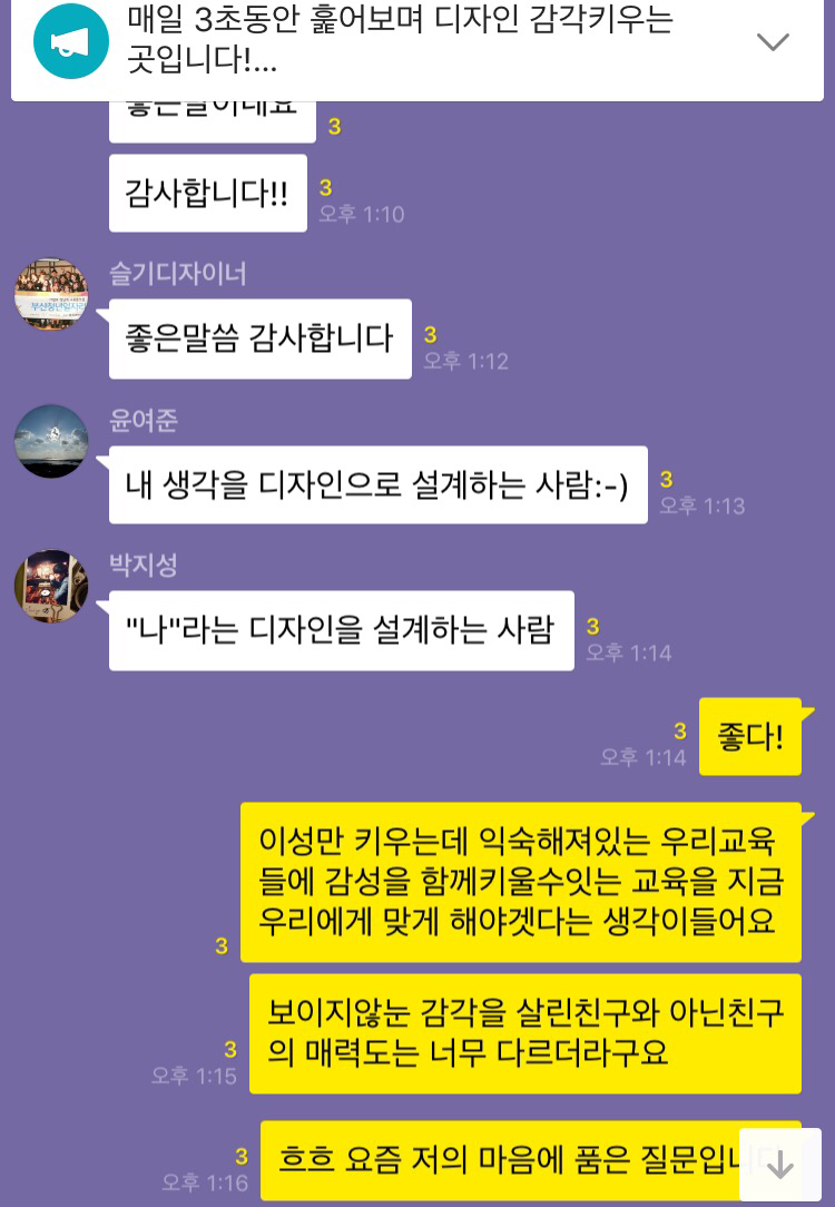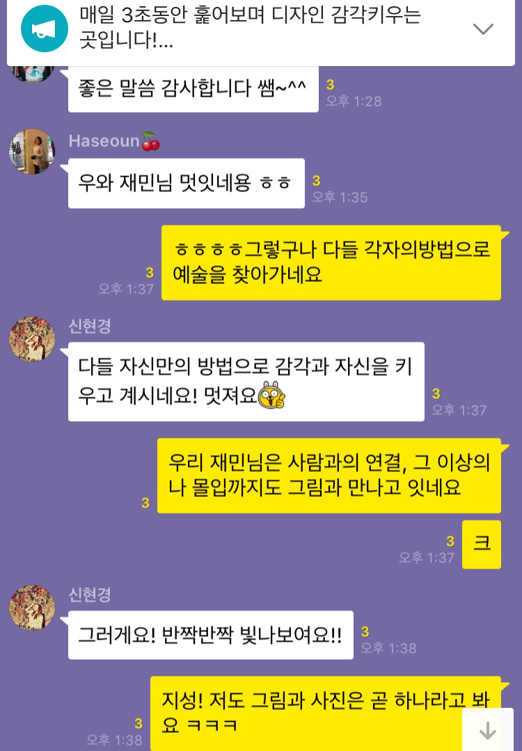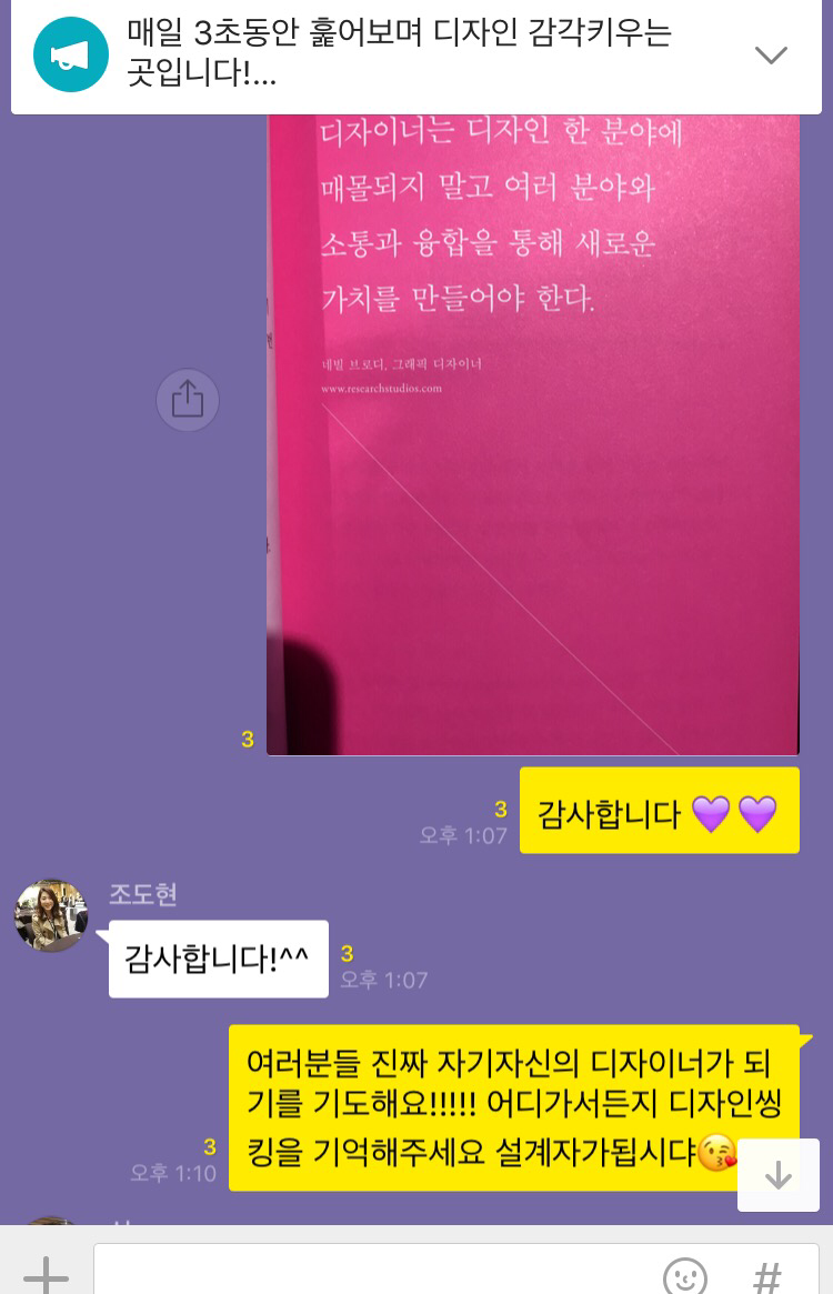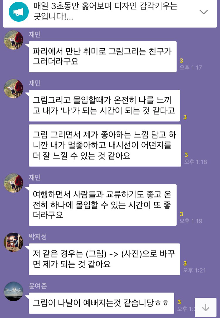가장 빠르게 바꿀 수 있는 환경은 카카오톡이었다. "하루 3초 센스업 디자인" 모든 사람들이 들어올 수 있는 채팅창. 가끔은 나도 참여자들이 공유해주는 디자인을 보고 배우기도 하고, 어쩔땐 내 영감이 되어준 것들을 공유하기도 하며, 대화를 나눈다.