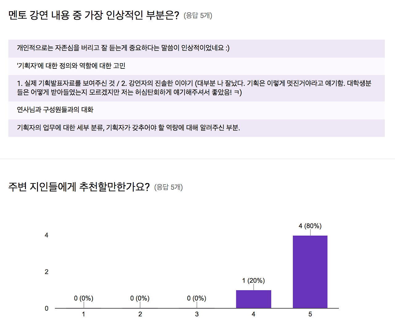 원래는 멘토링 진행에 90분 정도면 충분하겠지 싶었다. 근데 140분여를 쉬지 않고 달려왔다. 그만큼 이두행 멘토가 많은 준비를 해왔고, 이에 맞춰 멘티들도 다양한 질문을 더했다. 이렇게 쉼없이 달려온 멘토링에 대한 멘티들의 만족도는 어땠을까? 이후 진행한 설문조사로 취합한 고객 만족도는 이렇다. (지수가 높을수록 긍정치임)