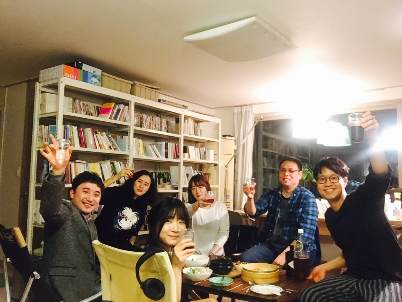 이 자리에 동네 주민으로 친해진 조성균 형님(이하 맥스형, 아래 사진 오른쪽에서 두번째)도 함께 했다. 맥스형은 연희동 인근에서 '수다캠프'라는 고기집을 운영하며, 그 건물 2층 공간을 미술작가들의 작업실로 개방해서 신진 작가들을 후원하고 있었다. 그런 맥스형에게 남의 집 프로젝트가 영감을 준 모양이다.