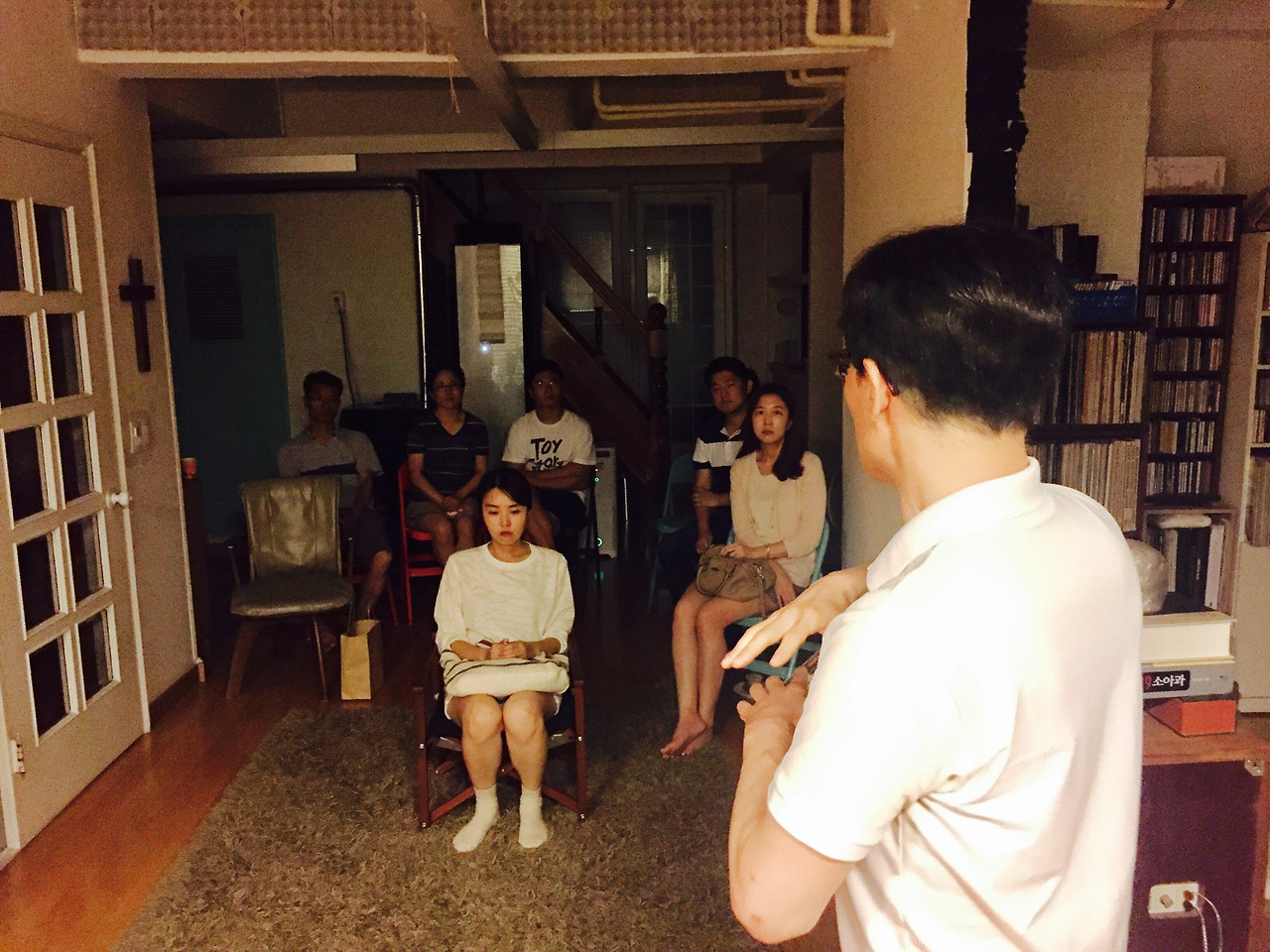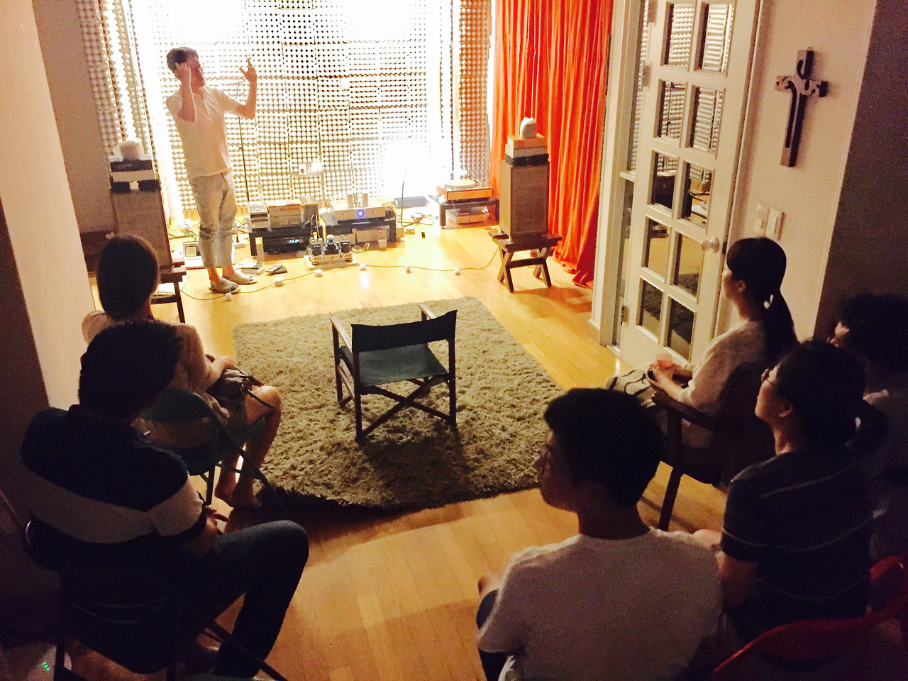 이렇게 총 6명의 손님들을 모시고 음악감상실 문을 열었다. 오디오 세팅 구조상 최적의 사운드를 감상할 수 있는 지점에 의자를 배치하고 손님들이 둘러 앉았다. 한명씩 돌아가며 가운데 의자에 앉는 기회를 점유하는 몰빵구조라고나 할까? 위 사진에 보이는 것처럼 거리상 큰 차이가 없기에 뭐가 다르겠어? 싶을 수 있으나 노노. 천지차이다. 저 의자에 앉으면 턴테이블에 올려진 음반의 콩나물들이 일제히 나의 귓구멍을 관통해 오장육부를 휘젓는 듯한 짜릿함이 든다. (이 표현은 좀 오바려나?ㅎ)