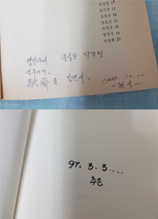 김용택 님의 누렇게 바래진 <섬진강> 여백에 1988년 병원에서 생일을 맞은 성자라는 사람에게 쓴 현식의 메모를 읽고는 30년이 지난 지금 성자 씨가 어디선가 현식 씨와 건강하게 잘 지내기를 바라는 마음으로 짧은 기도를 드리기도 했습니다.