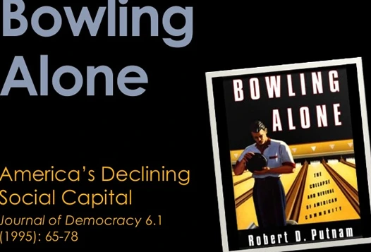 그 주장을 묶어 낸 책이 ‘나 홀로 볼링’이다. 사회적 자본을 챙겨줄 하부구조 중 하나인 마을 내 볼링장이 점차 사라질 뿐 아니라 혼자서 볼링을 치는 사람이 늘고 있다고 책에서 밝힌다. 가족, 이웃, 친구들이 한데 모이는 자리가 사라지니, 그런 시간도 줄고 자연히 사회적 자본의 감소로 이어진다는 논리다.