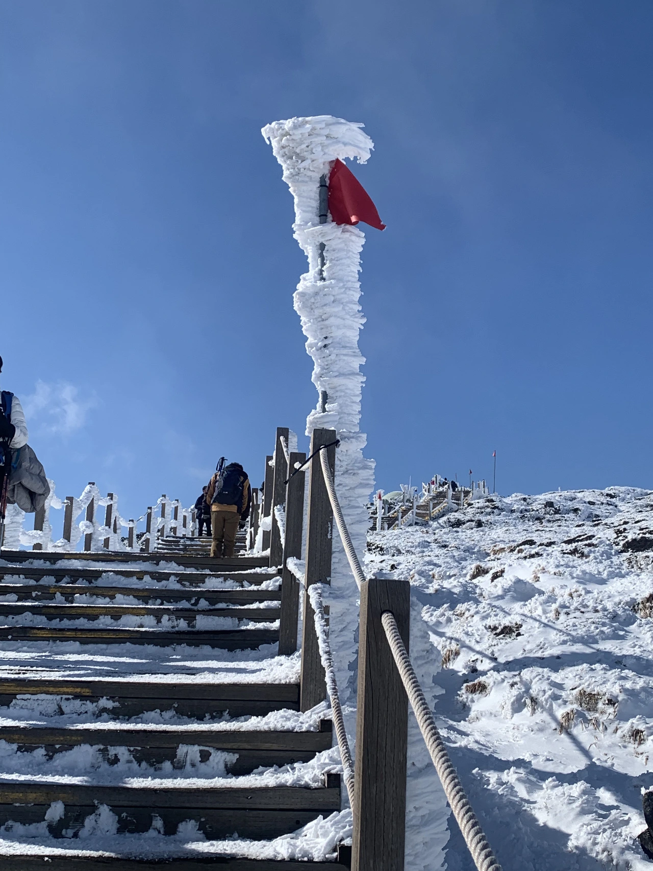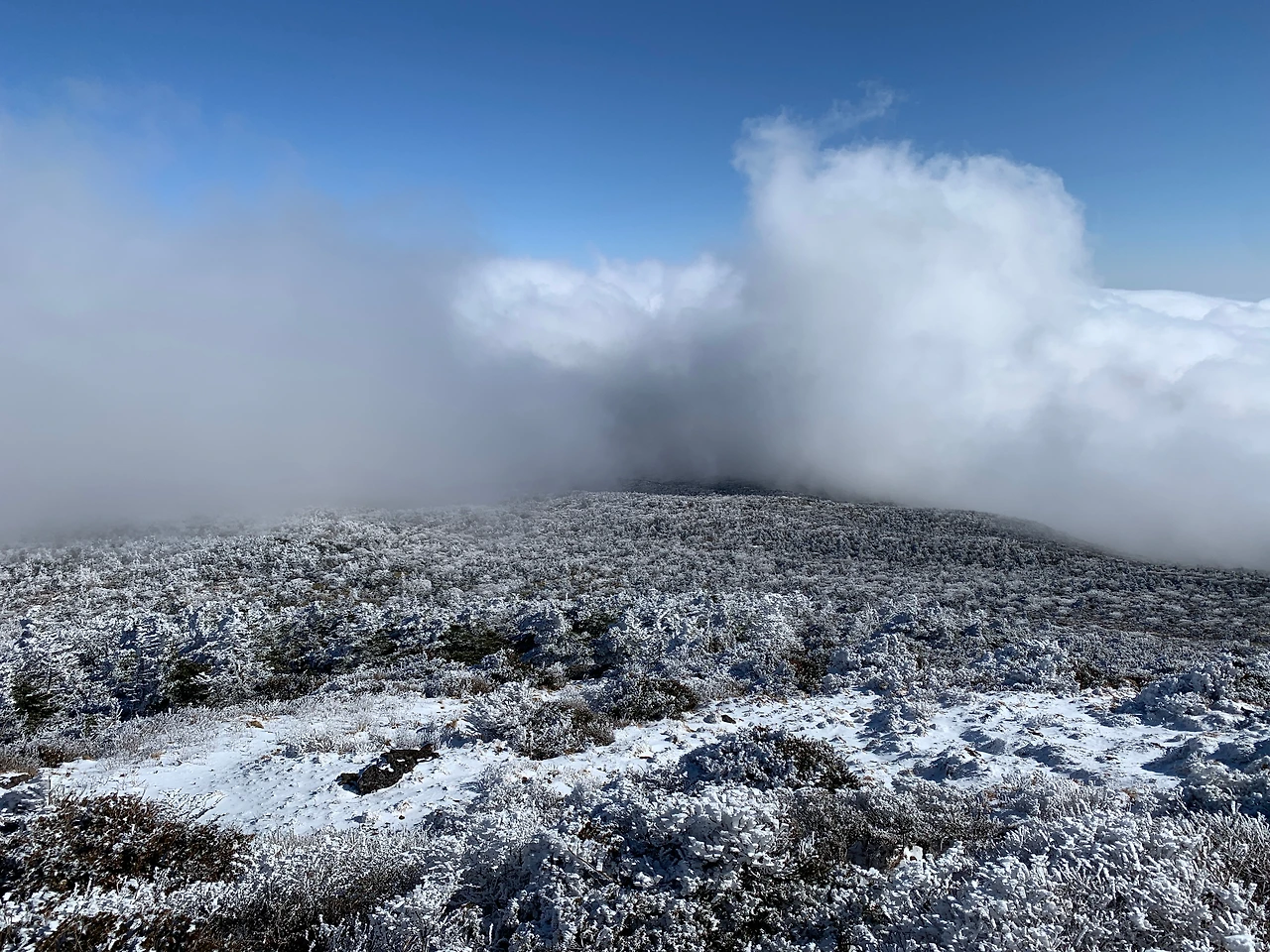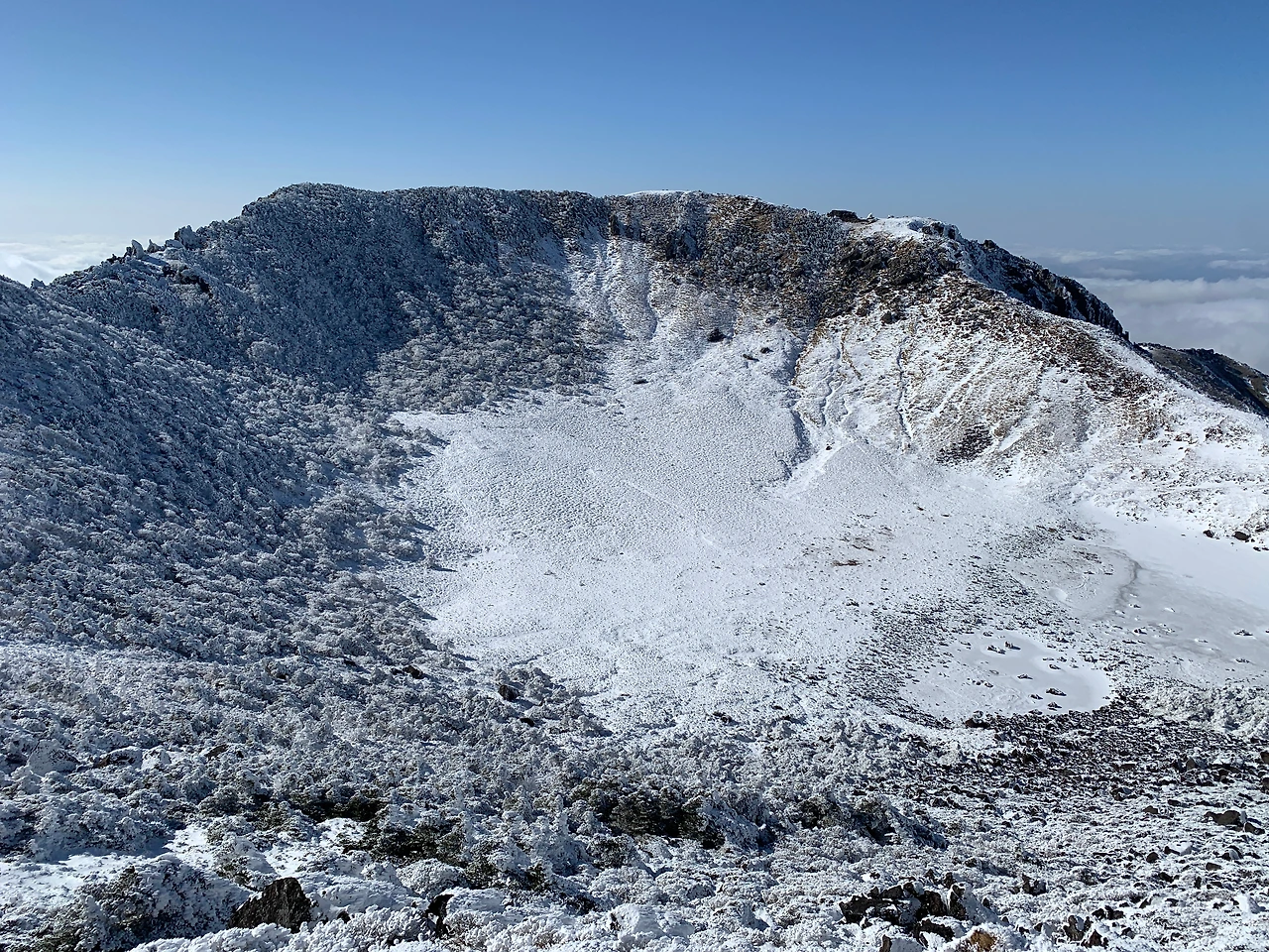 변덕스러운 날씨에 안개가 자주 낀다고 하는데 다행히 강한 바람이 안개를 옮겨 눈 내린 백록담의 모습도 온전히 볼 수 있었다.