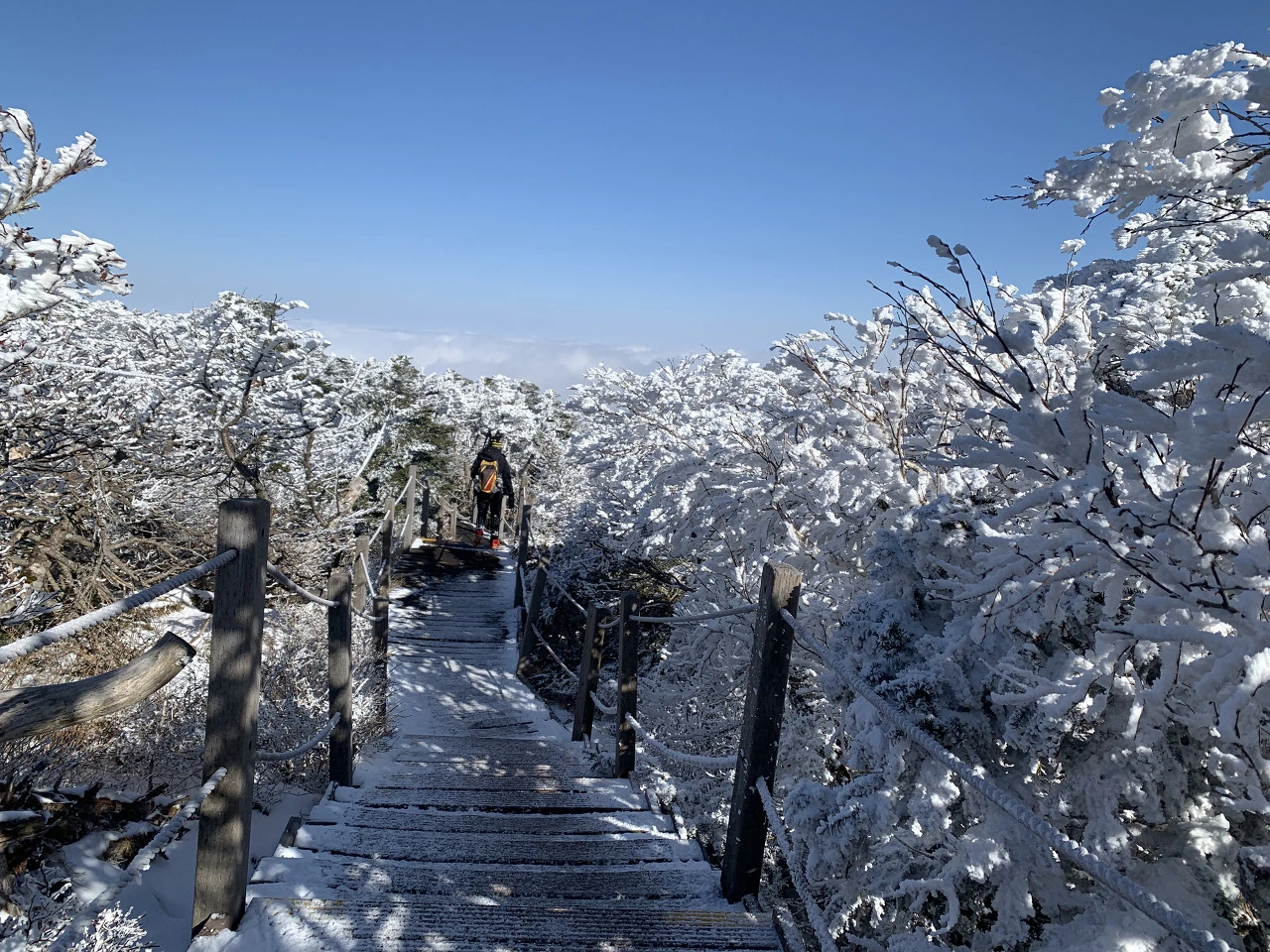 끝없이 펼쳐진 설경을 보며 한참을 올라가다 보니 사진으로만 보던 상고대가 나무마다 활짝 펴 있었다.