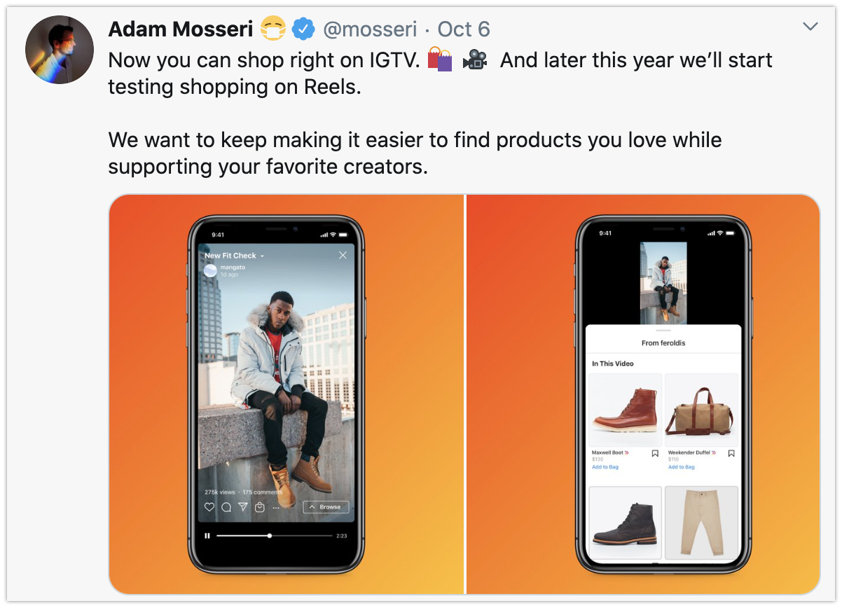 아담 모세리는 인스타그램 창업자 케빈 시스트롬(Kevin Systrom)과 마이크 크리거(Mike Krieger)가 사임한 이후, 인스타그램 총괄(Head of Instagram)로서 인스타그램 제품 전반을 책임지고 있는 인물입니다. 그가 지난 10월 6일에 자신의 트위터에 IGTV의 쇼핑 기능을 출시를 알렸습니다. 더불어 인스타그램의 틱톡이라 할 수 있는 숏폼 동영상 기능 릴(Reels)에 올해 말 쇼핑 기능이 적용될 예정이라 밝혔습니다. IGTV 동영상은 인스타그램 숍(Instagram Shop)에서도 이용이 가능하며, 인스타그램 사용자는 앞으로 IGTV 비디오를 통해 자신이 원하는 제품을 확인하고, 인스타그램 체크아웃(Checkout) 또는 셀러의 웹사이트에서 결제할 수 있습니다.