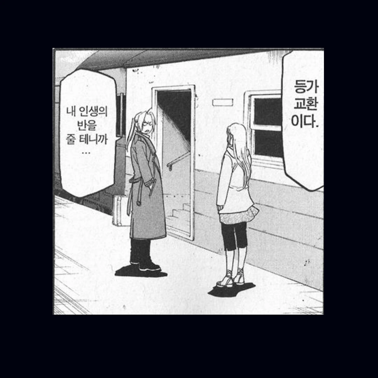 에드워드 : "등가교환(等價交換)이다! 내 인생의 절반을 줄테니, 네 인생의 절반을 줘."